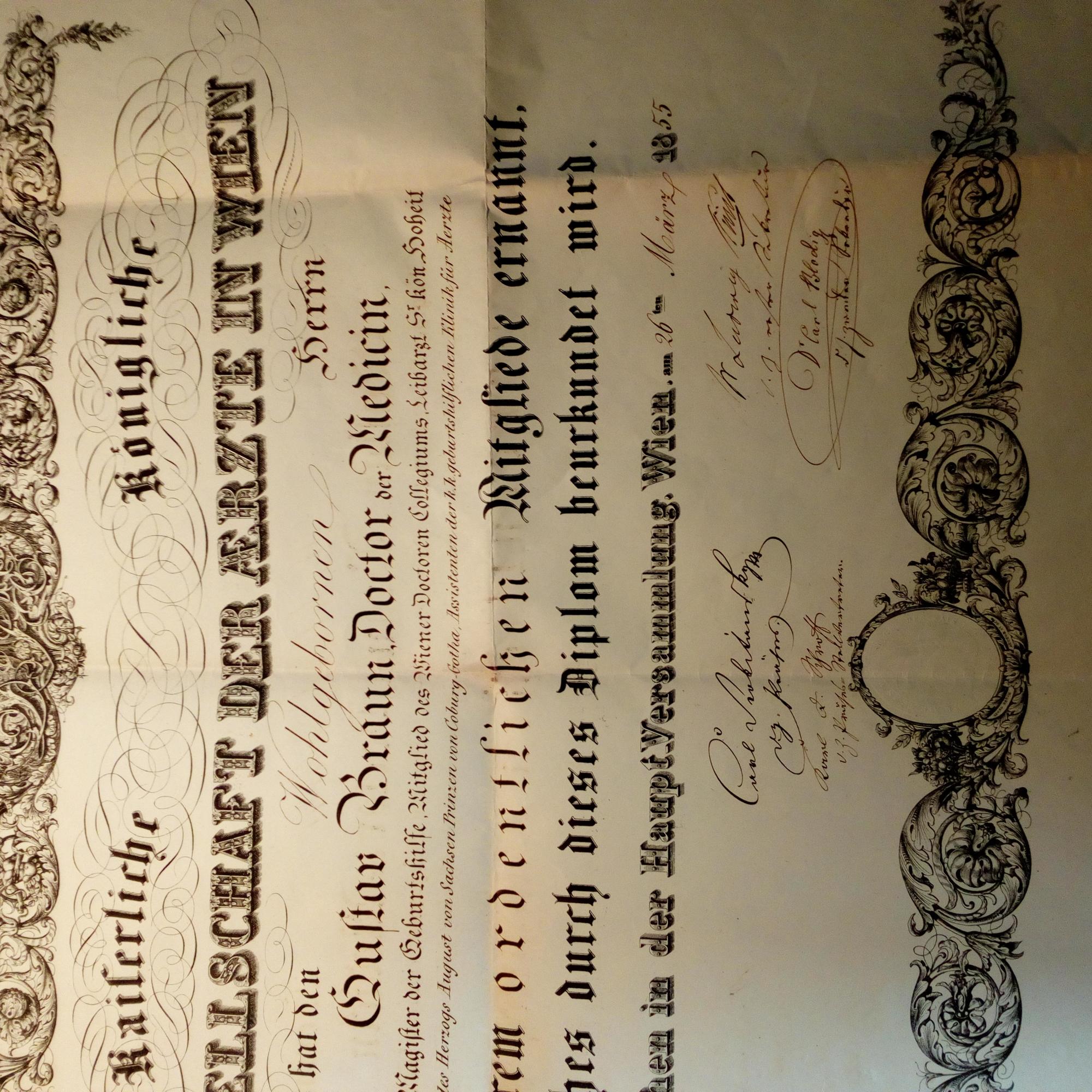 1829-1911, Wiener Arzt, Leibarzt des Kaisers - Große Aufnahmeurkunde in die "Gesellschaft der Ärzte" in Wien, ca. 48x60 cm, prachtvoller ausgef. Vordruck, Wien 26.3.1855. Unterschr. haben: der Präsident Carl Rokitansky (1804-78, Pathologe, Philosoph und Politiker), sein Stellveretreter Carl F. Schmidt, als 1. Sekretär Ludwig Fürst und als 2. Sekretär der Ophtamologe Carl Blodig (1820-91).