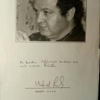1928-98, Journalist und Schriftsteller poln. Herkunft - Typoskript-Seite (vollst. satirischer Aphorismus "Der Stuhl") mit e. Korrekturen, nachträglich mit Widm., U. und D. versehen, Beschädigungen. Dazu kl. Zeitungsartikel 1978. Beiliegen: 4°-Blatt mit e. Zitat und U. unter Hochglanz-Pfo., und U. und D. 1987 auf Vorsatz seines Buches "Gespräche mit dem Vogel", Knaus-Verl., 1984, verl.frisch.