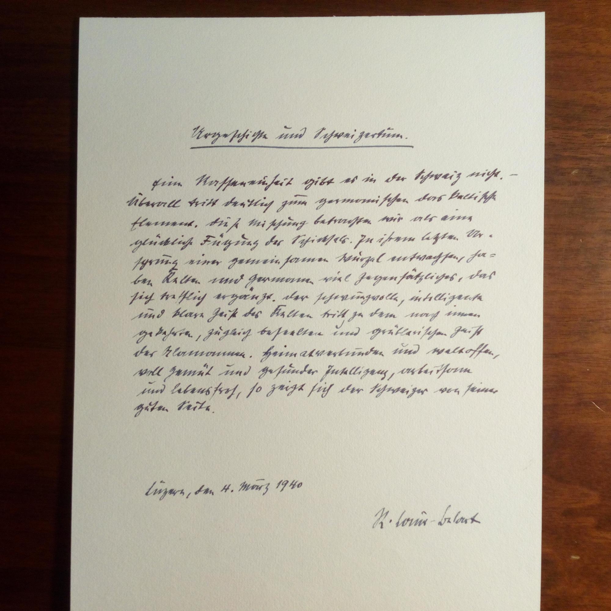 1898-1972, schweiz. Archäologe - 4°-Bl. m. e. Text "Vorgeschichte u. Schweizertum", m. U., Luzern 4.3.1940, dekorativ.
