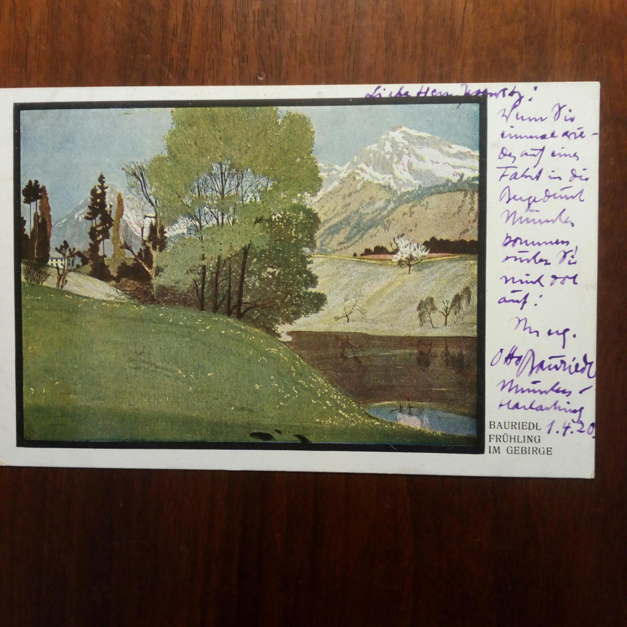 1879-1961, Maler und Graphiker - E. postal. Ansichtskarte (sein Gemälde "Frühling im Gebirge") mit U., München 1.4.1920. Lädt Hans Jesewitz in Holnstein zu sich ein.
