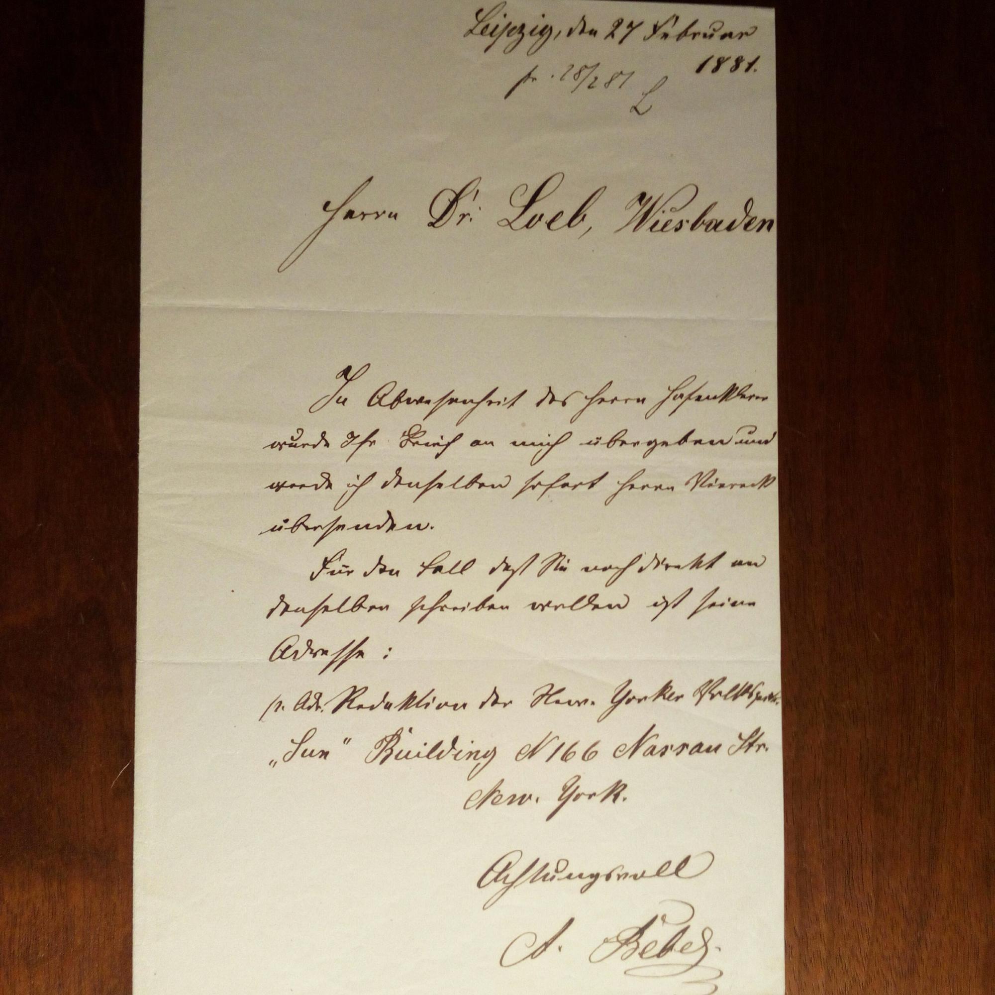 1840-1913, Politiker, mit Karl Liebknecht Begr. der dt. Sozialdemokratie - Schöner e. Brief mit U., Leipzig 27.11.1881, 1 S. gr. 8°. An Dr. Löb in Wiesbaden: ...In Abwesenheit des Herrn Hasenklever (Wilhelm Hasenclever, 1827-89, Politiker und Journalist) wurde Ihr Brief an mich übergeben und werde ich denselben sofort an Herrn Viereck (Louis von, 1851-1922, Politiker und Journalist) übersenden...seine Adresse: Redaktion der New Yorker Volkszeit. "Sun" Building N166 Nassau Str. ... Abbildung.