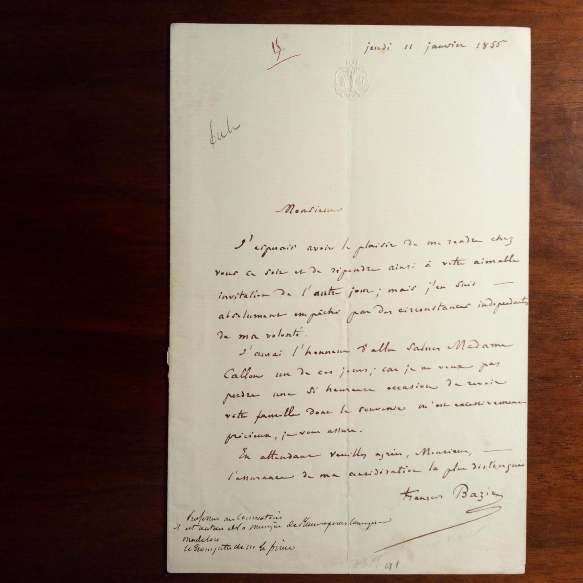 1816-78, frz. Komponist - E. Br. m. U., 11.1.1855, 1 S. 8°, kl. Schrift, gepr. Emblem am Kopf, Sammlernotiz. Sagt Herrn Callon einer Einladung ab. ...une si heureuse occasion de revoir votre famille dont le souvenir m'est ecettivement pricieux, je vous allure...