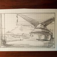 1925-2014, Maler - Notizblatt mit e. Bleistift-Zeichnung ("Alter Kranen" in Würzburg) mit U. Weitere U. auf Rückseite. Mit e. postal. Umschlag (1.5.2004).