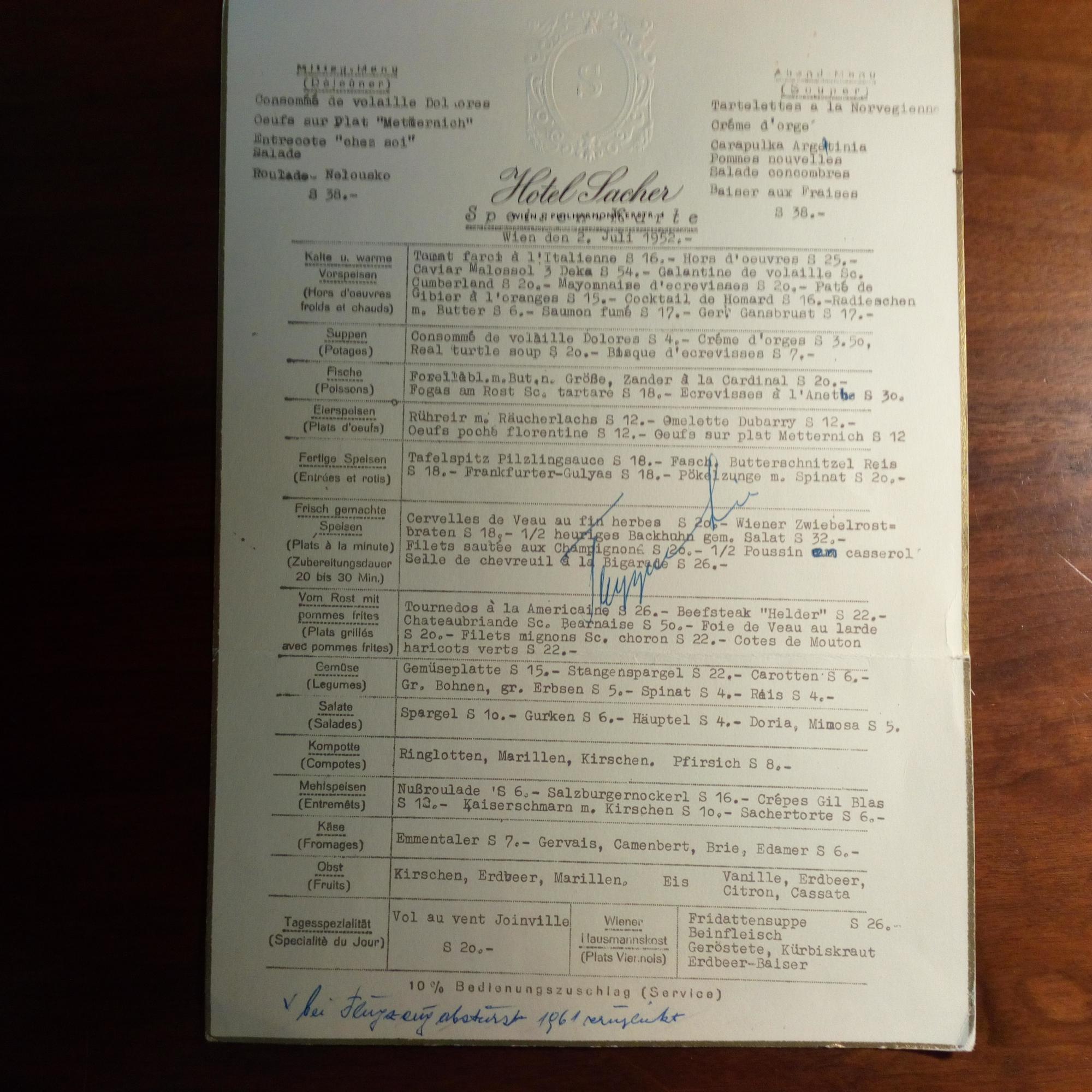 1896-1968, norweg. Politiker, erster Gen.sekretär der UNO - Tageskarte des Restaurants "Hotel Sacher" in Wien vom 2.7.1952 mit U. Dazu zeitgen. Presseartikel (mit Bild) zu diesem Staatsbesuch.