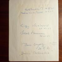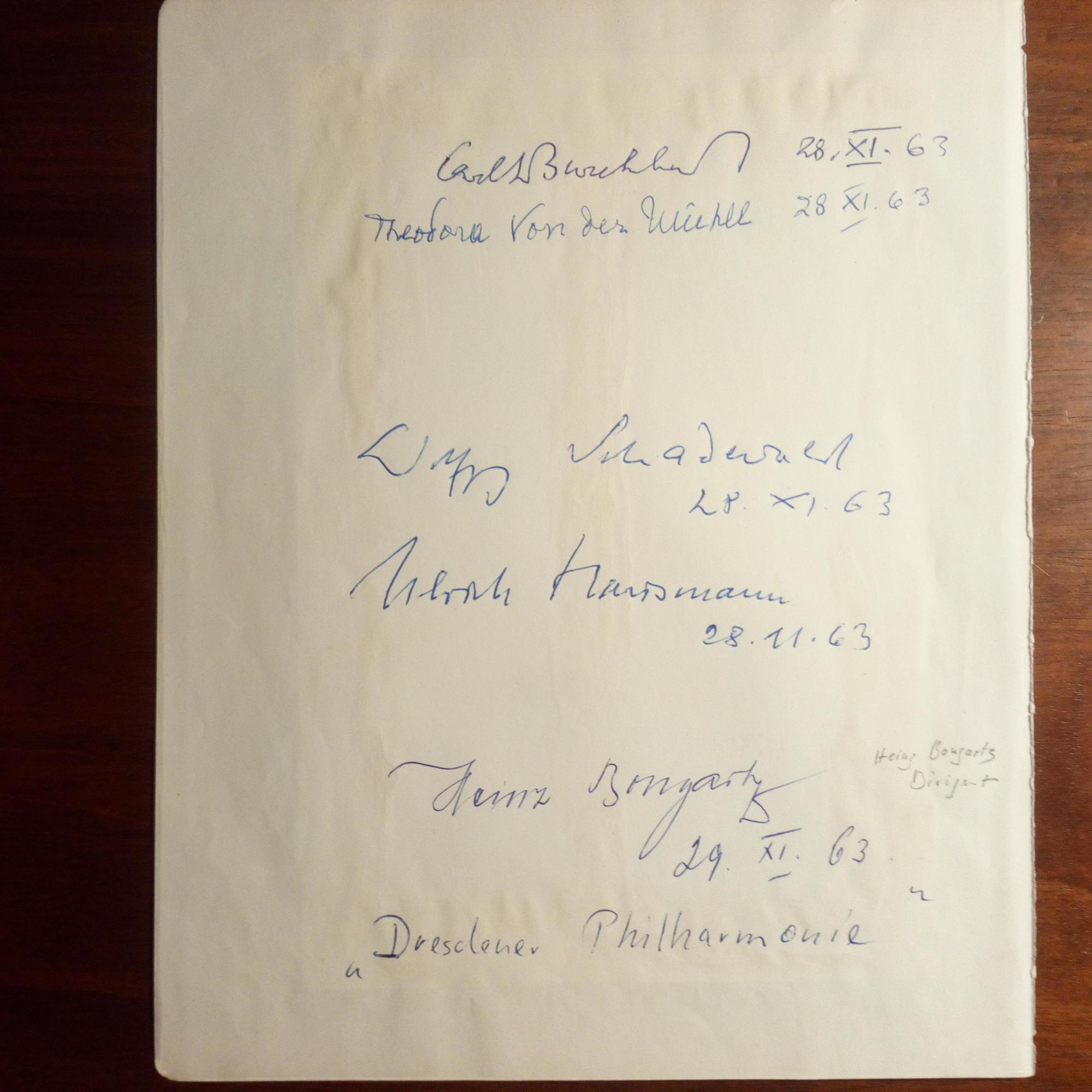 4°-Albumblatt m. U. u. D. des schweizer Historikers, Diplomaten und Schriftstellers Carl Jakob Burckhardt (1891-1974), seiner Begleitung, der Schriftstellerin Theodora von der Mühle, des Literaturwiss. Wolfgang Schadewald (1900-74), des Archäologen Ulrich Hausmann (1917-96), des Dirigenten Heinz Bongartz (1894-1978, m. Zusatz "Dresdner Philhar-monie"). Auf Rückseite mont. ist Programmblatt der "Mährischen Philhar-monie" m. U. des Dirigenten Josef Daniel (1928-86) und der tschech. Mezzosopranistin Ivana Mixova (1930-2002). Alle Nov. 1963.