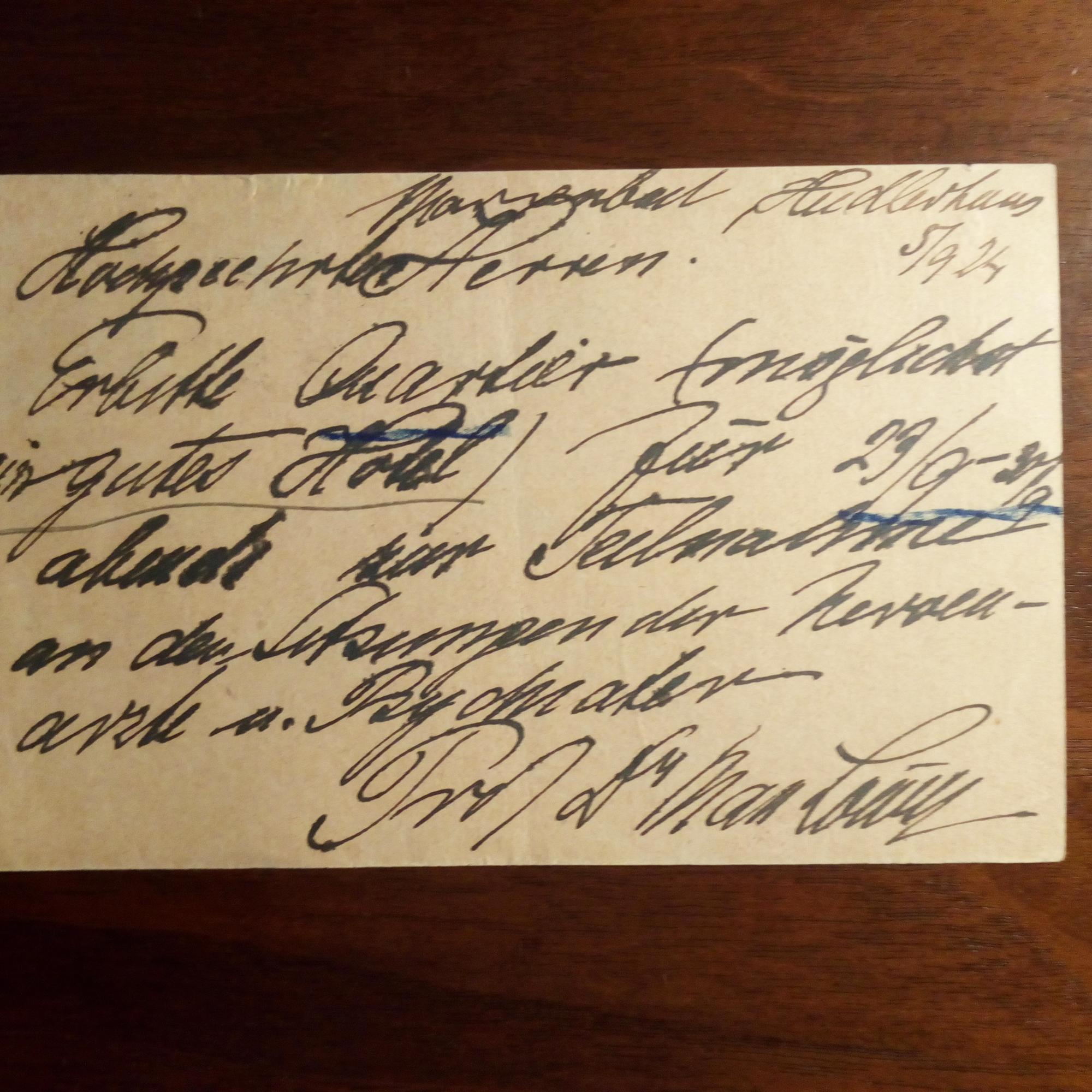 1875-1949, Psychiater und Balneologe, Holocaust-Überlebender - E. postal. Postkarte mit U., Marienbad 5.9.1924, Abs.stempel, ger. Altersspuren. An den Psychiater und Neurologen Carl Mayer (1862-1936) in Innsbruck: Bittet "zur Teilnahme an den Sitzungen der Nervenärzte und Psychiater" um ein Quartier ("möglichst ein gutes Hotel"). Beiliegen ähnl. von den Neurologen F. W. Stein, Teplitz-Schönau, 16.7.1924, und Eleonore zu Salm-Salm (1887-1978), Carezza 5.9.1924.