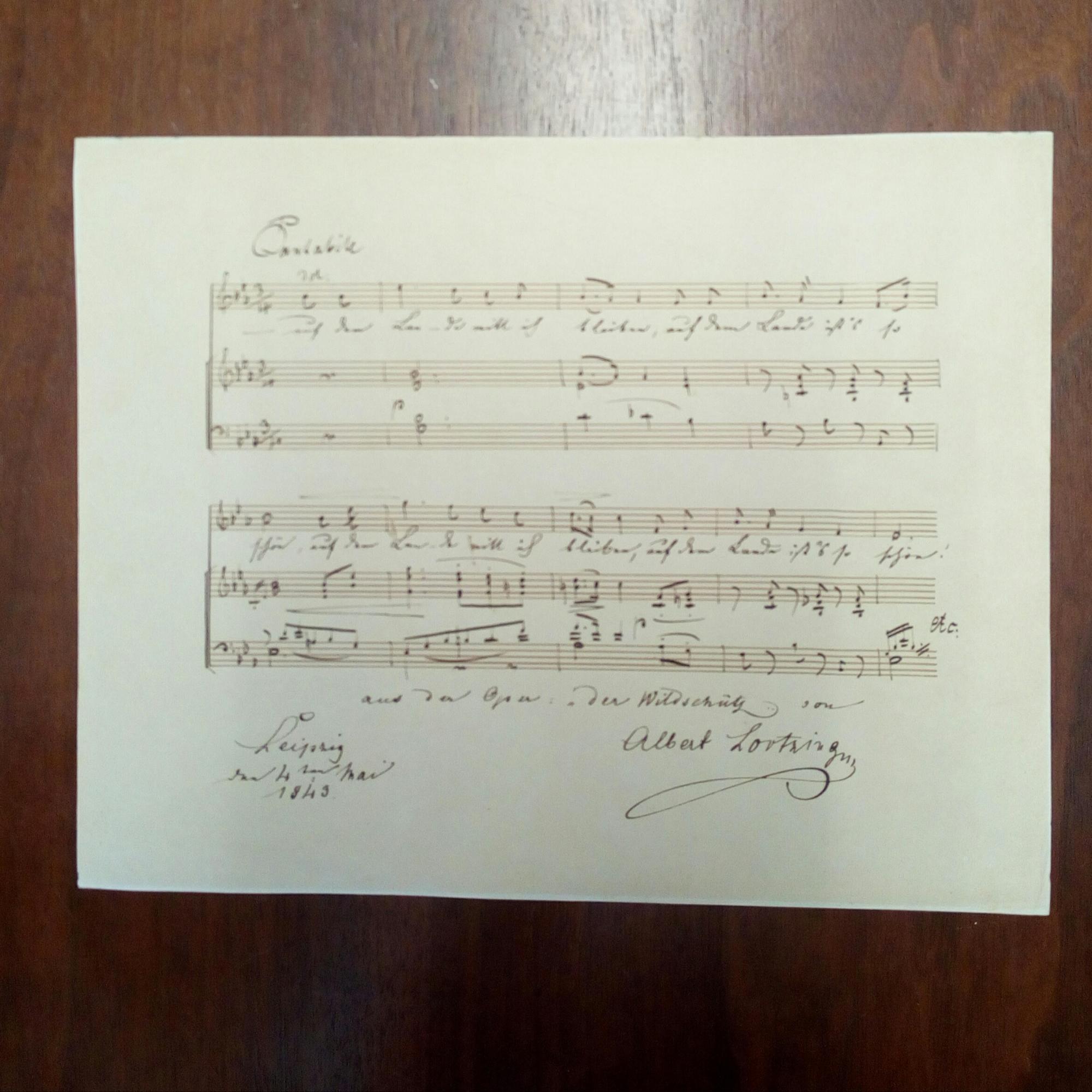 1801-51, Komponist, Librettist, Sänger und Dirigent - 4°-quer-Notenblatt mit e. Noten, Text, U., Leipzig 4.5.1849. 9 Takte (Klavier und Gesang) aus seiner Oper "Der Wildschütz" (2. Akt, 3. Auftritt, "Baronin Freimann"), bez. "Cantabile". (Die Oper war am 31.12.1842 im Leipziger Stadttheater uraufgeführt worden.).