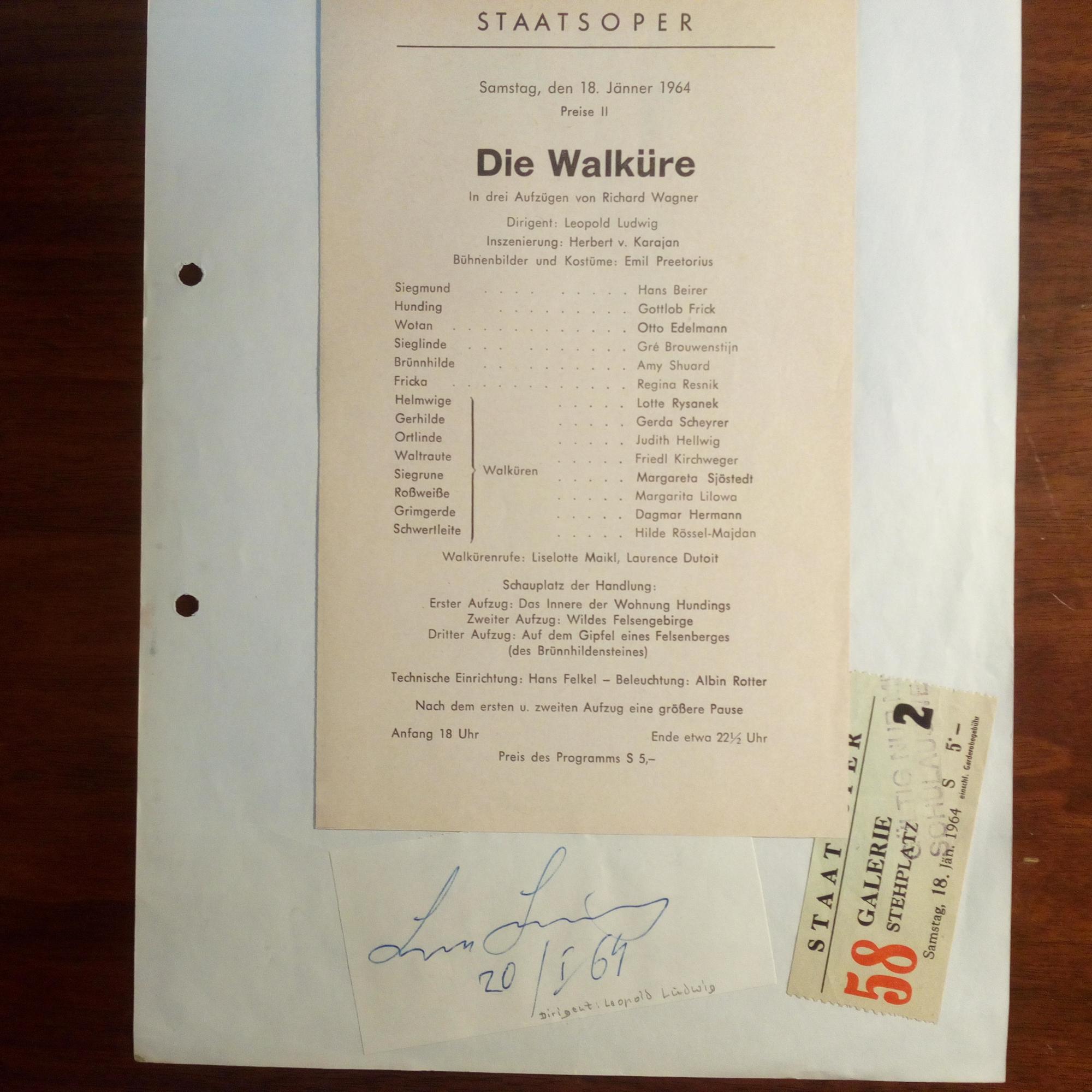 1908-79, Dirigent - Kl. Blatt m. U. u. D. 20.1.1964, zus. mit Programmblatt und Eintrittskarte zu einem Konzert der Wiener Staatsoper am 18.1.1964 ("Die Walküre") mont. auf 4°.
