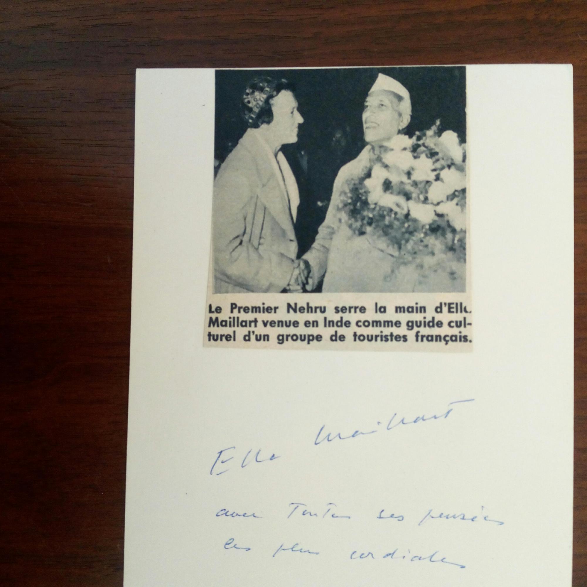 1903-97, schweiz. Sportlerin und Reiseschriftstellerin - Karte mit U. und e. Zusatz unter mont. kl. Presse-Foto (Empfang b. ind. Präs. Jawaharlal Nehru). Mit postal. Umschl. (Bethlehem 27.12.1960).