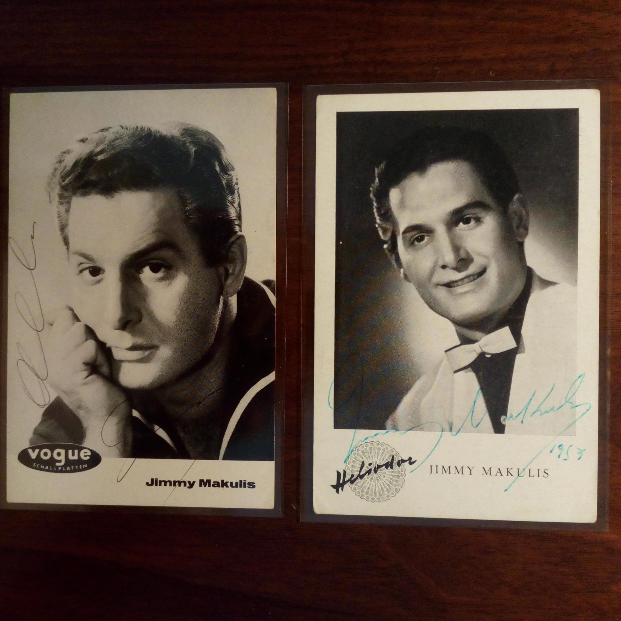 1935-2007, griech.-dt. Schlagersänger - Pfo. (Heliodor-Schallplatten) m. ganzer U. u. Jahr 1957. Beiliegt etw. älteres Pfo. (Vogue-Schallplatten) m. E. u. U. ("Jimmy").