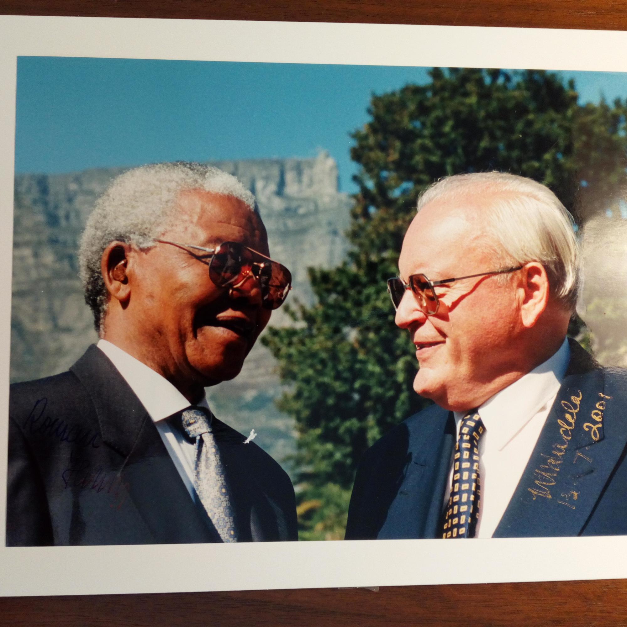 1918-2013, südafrikan. Freiheits-Kämpfer und Präsident - Farb-Pfo. (ca. 4°quer, Hochglanz, biograph. Text auf Rückseite, zus. mit Bundespräsident Roman Herzog bei dessen Staatsbesuch in Kapstadt am 10.3.1998) mit beiden U. (je beim anderen), die von Mandela mit D. 13.7.2001, gold. Tusche, minimal berieben.