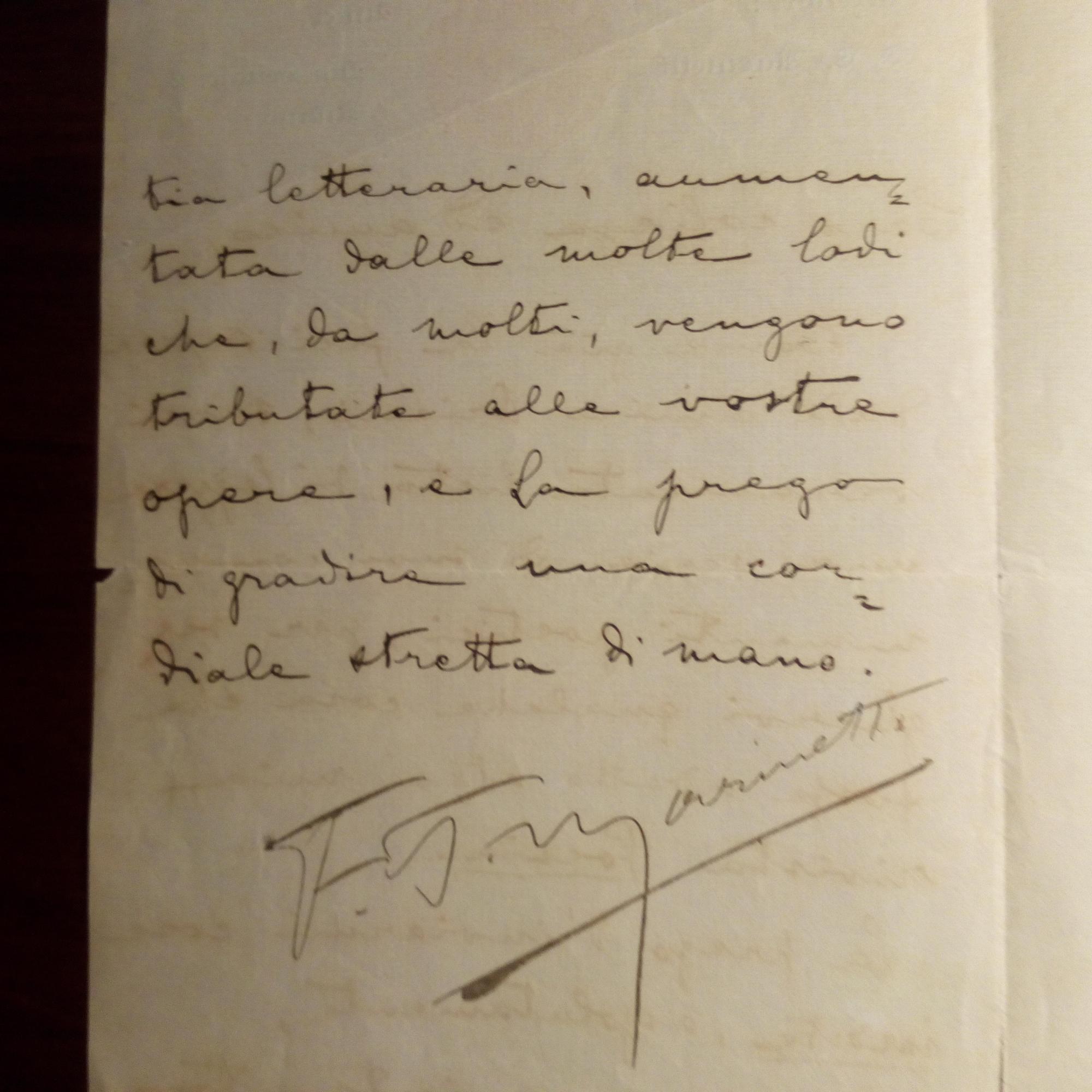 1876-1944, italien. Schriftsteller, faschist. Politiker, Begr. des "Futurismus" - E. Brief mit U., (Milano, nach 1905), 1 ¾ S. 8°. Schöner Br.kopf mit rotem Emblem seiner Zeitschrift "Poesia", minimale Gebr.spuren. Dankt einem "caro collega ed amico" für eine Sendung: ...sarei veramente lieto leggere una serie di sui componimenti poetici, per sceliervi qualche cosa che fosse adatto alla mia rivista Poesia...