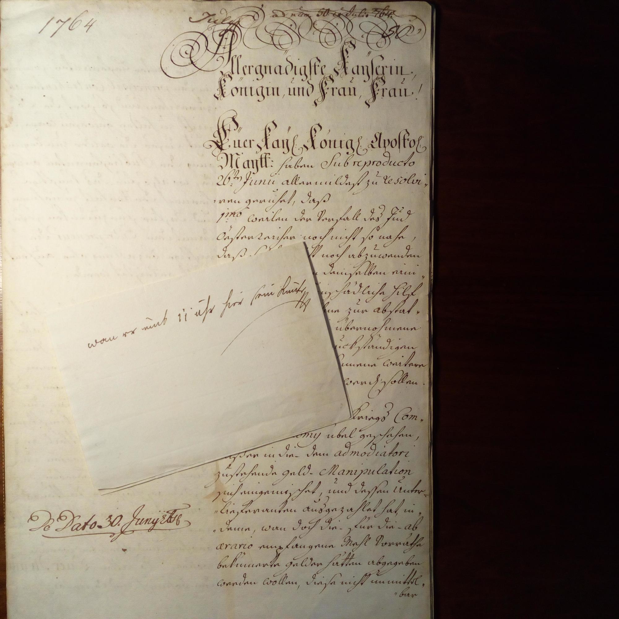 1717-80, Erzherzogin, führte für ihren Gatten Kaiser Franz I. von Österreich die Reg.geschäfte - Anmerkung "Diese Anzeige nehme zur Nachricht, und begnehmige Ich Dir auf meinen Befehl erlassene Expeditiones" und U. am Schluss eines Briefes an sie mit U. von Hofkriegsratspräsident Leopold Josef von Daun (1705-66), Gegenzeichnung des Hofkanzlers Johann Chotek von Chotkow (1704-87), Wien 30.6.1764, 16 S. folio, halbseitig beschr., mit Regestblatt, Schnur-gebunden. "Über die dem Jud Oesterreicher auf weitere 6. Monath besehene Vergütungs Erstreckung der von ihm in Oesterreich, und Böhmen übernommenen aerarischen Vorräthe". Beiliegt kl. Blatt mit e. "Wan er umb 11 uhr hier sein kunte" und U. (Paraphe).
