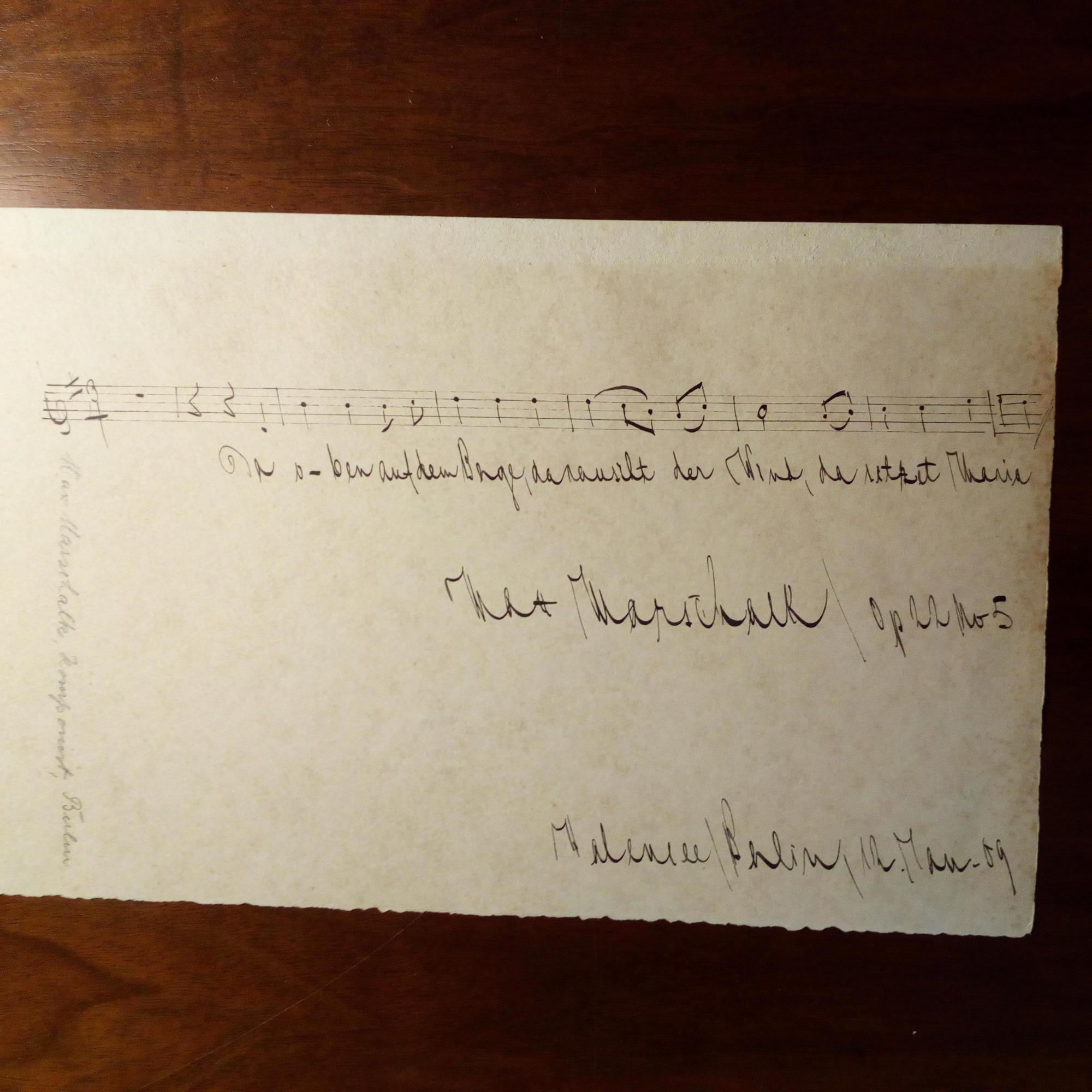 1863-1940, Komponist, Musikkritiker - kl. 4°quer-Schmuckblatt mit e. Notenzeile (6 Takte, "Da oben auf dem Berge, da rauscht der Wind, da sitzet Maria... Op.22No5") und U., Berlin 12.1.1909.