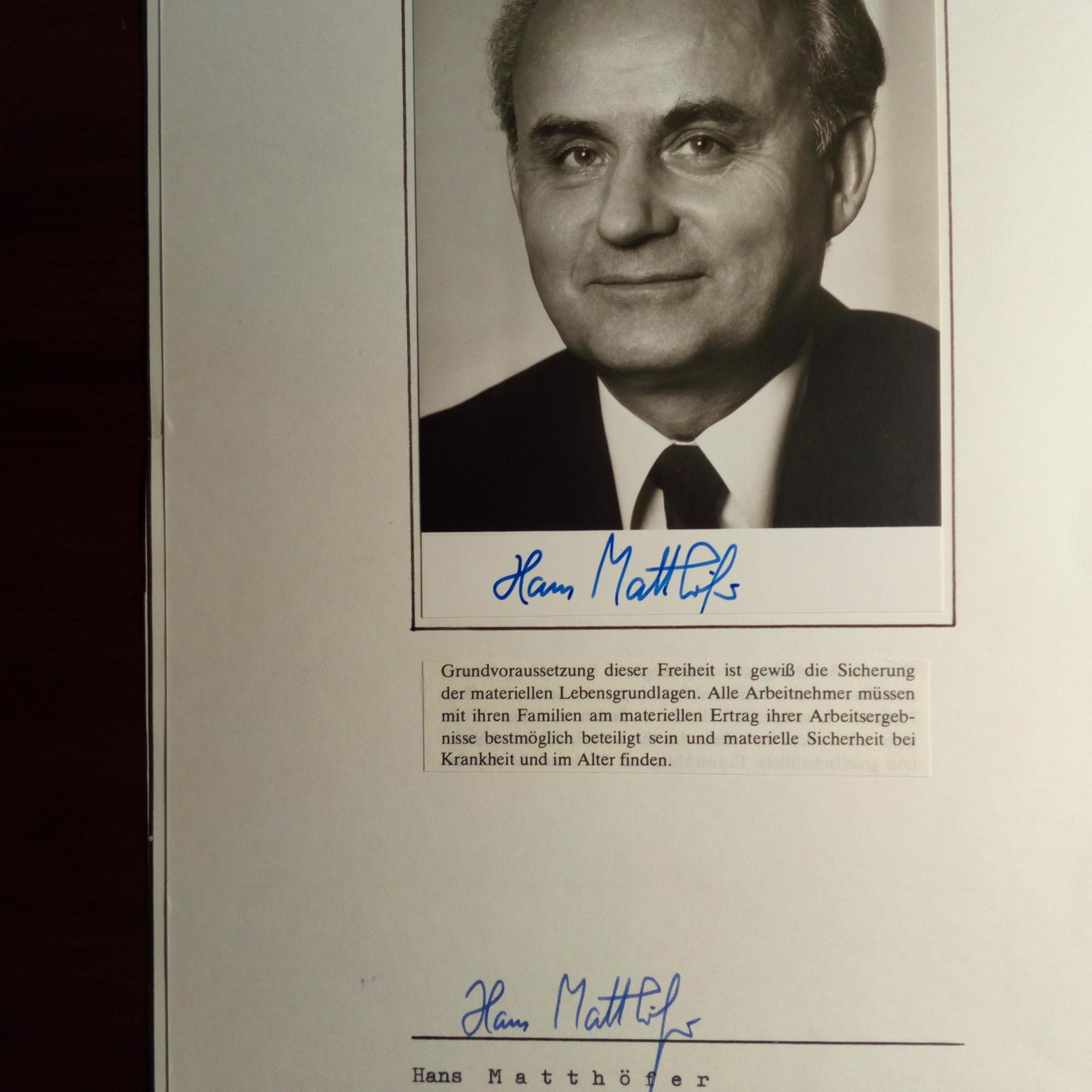 1925-2009, SPD-Politiker - 3 versch. Pfo. m. U. Dazu Ded.kärtchen m. e. Grüßen u. U. seiner Sekretärin.