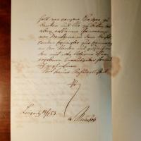 1806-87, Künstler, Sammler und Fotograf - E. Brief mit U., Liegnitz 19.2.1853, 2 S. gr. 8°, e. Anschrift, Siegelrest. An den Dir. der kgl. Kunstkammer in Berlin Leopold von Ledebur (1799-1877): Bedankt sich für die "freundlichen Bemühungen um mein Werk" u. schickt das "eben erschienene Panorama von Drontheim". M. Sammlerblatt.