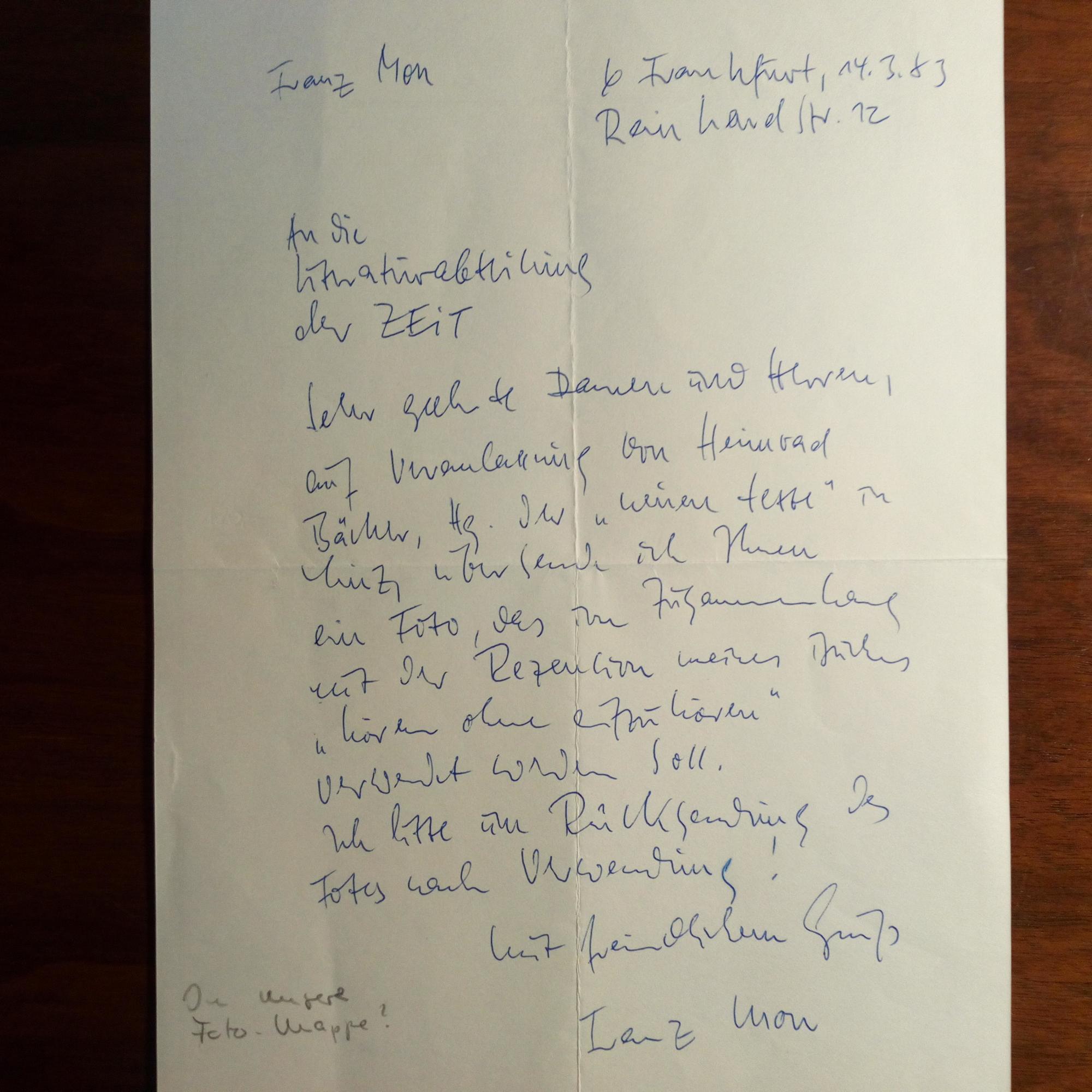 1926-2022, Dichter ("Konkrete Poesie") - E. Brief mit U., Frankfurt 14.3.1983, 1 S. 4°, mit e. postal. Umschlag. "An die Literaturabteilung der ZEIT" betr. eines Fotos für die Rezension seines Buches "hören ohne aufzuhören". Beiliegt Blatt mit e. Gedicht "Wenn die eins wie die neun/ ist die zwei wie die acht...", 10. Z., mit Widm. und U.