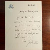 1897-1978, ab 1963 Papst Paul VI. - E. Brief mit U., Briefkopf als Staatssekretär "di sua santita", 21.6.1952, 1 S. 8°, ger. Faltspur. An einen "Monsignore Veneratissimo": ...Grazie die bei fiori che Ella mi ha mandato. Onnerano l'altare della mia Capella...