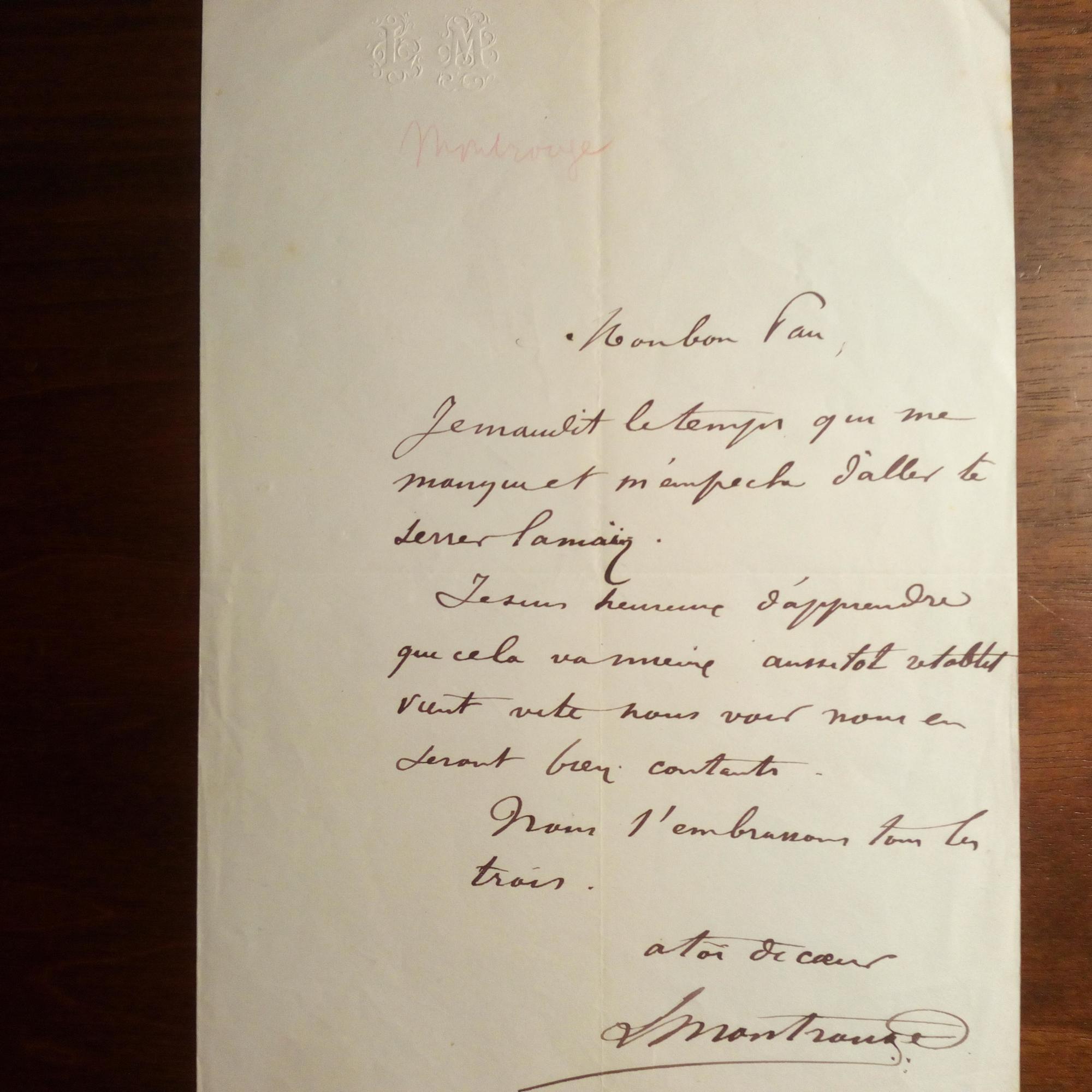 1825-1903, Schauspieler und Sänger in Paris - E. Brief mit U., Asnières 14.9.1880, 1 S. kl. 8°, rosa Papier, Briefkopf des "Théatre de l'Athénée Comique" (dessen Direktor er war), ger. Gebr.-spuren, mit e. postal. Umschlag. An J. Rainault in Paris: Dankt für die Nachricht vom Tode seines Freundes "Pan": ...Quand? Et comment il est mort?... Beiliegt e. Brief mit U., 1 S. 8°. An Pan: Teilt ihm mit, dass er ihn in ein Programm aufgenommen habe. ...Nous l'embrassons tous les trois...