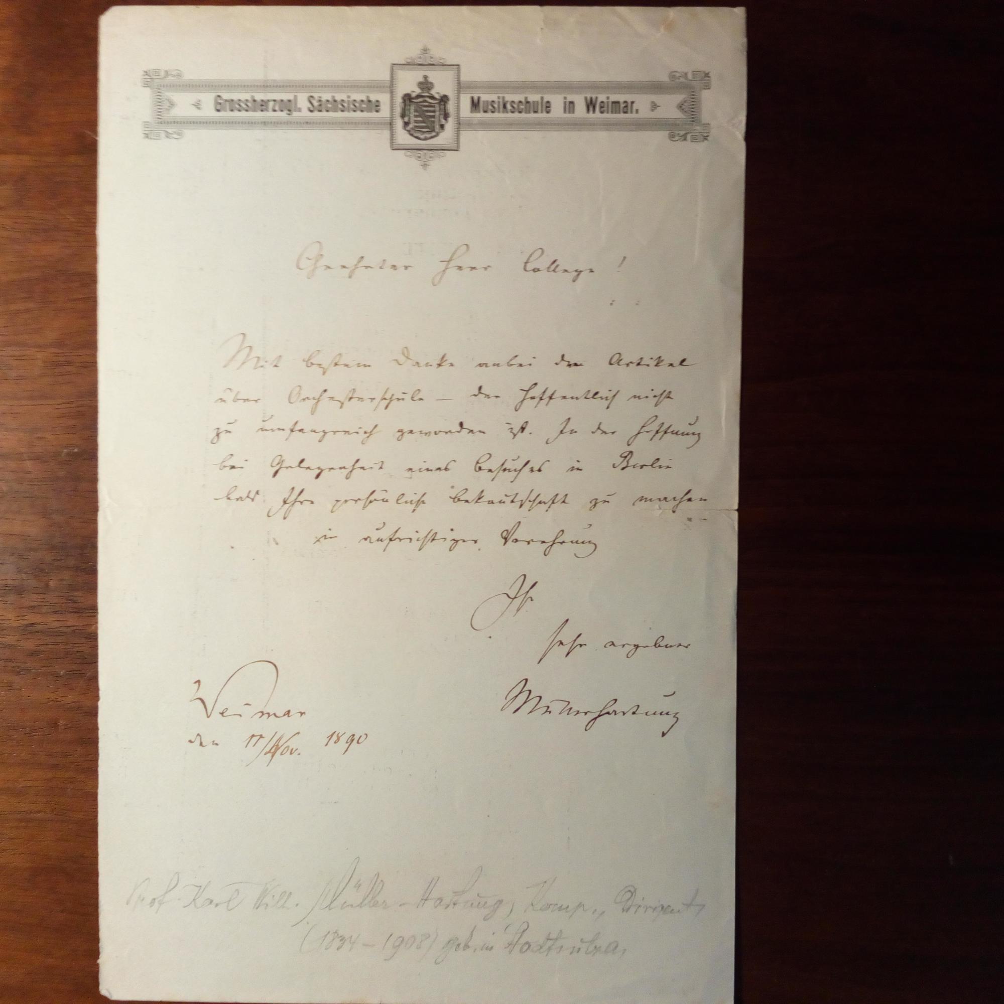 1834-1908, Dirigent und Komponist - E. Brief mit U, Weimar 17.11.1890, ¾ S. gr. 8°, Kopf der Herzogl. Musikschule, leichte Altersspuren. An einen "collegen": ...anbei der Artikel über Orchesterschule - der hoffentlich nicht zu umfangreich geworden ist...