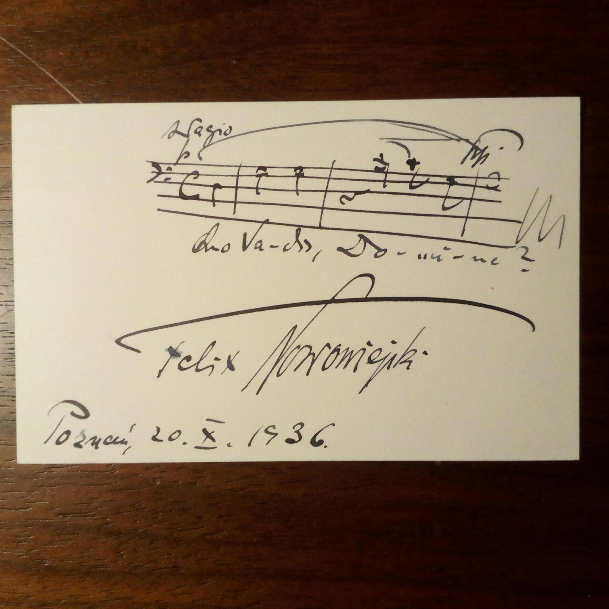 1877-1946, poln. Organist, Chorleiter und Komponist - Kärtchen mit e. Notenzeile (3 Takte, "Quo Vadis, Domine?"), U., O. und D. Poznán 20.10.1936.