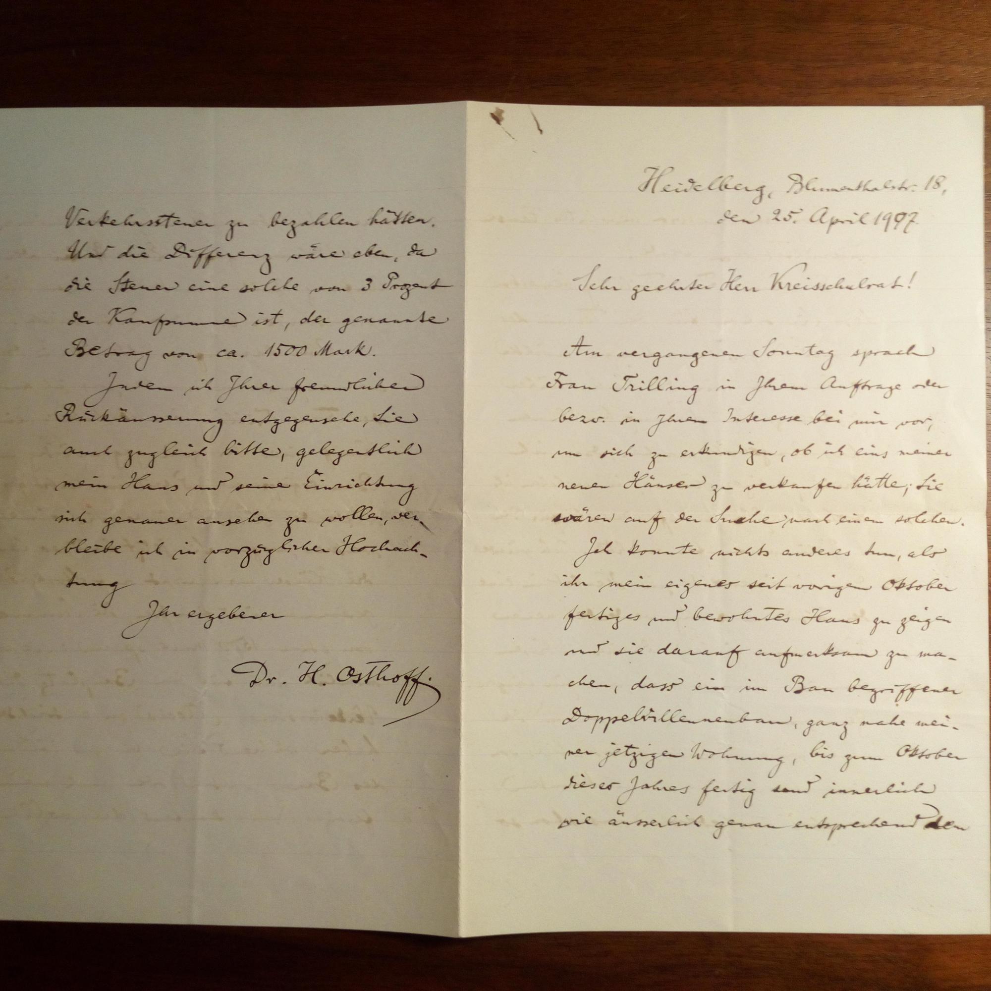 1847-1909, Sprachwissenschaftler - 1. E. postal. Postkarte mit U., Heidelberg 7.7.1900, dicht geschr. An den Lehrer und Publizisten Adolf Meuser in Mannheim: Gratuliert zum best. Examen des Sohnes und weist auf seinen Anteil dabei hin. Bittet um Rezension seiner "Freien Worte" in der "Neuen Badischen Landeszeitung". ...Die Kritik spricht sich allgemein höchst günstig für mich aus... Beiliegt e. Brief mit U., Heidelberg 25.4. 1907, 3 ¾ S. 8°. An "Herrn Kreisschulrat" betr. Immobiliengeschäften.