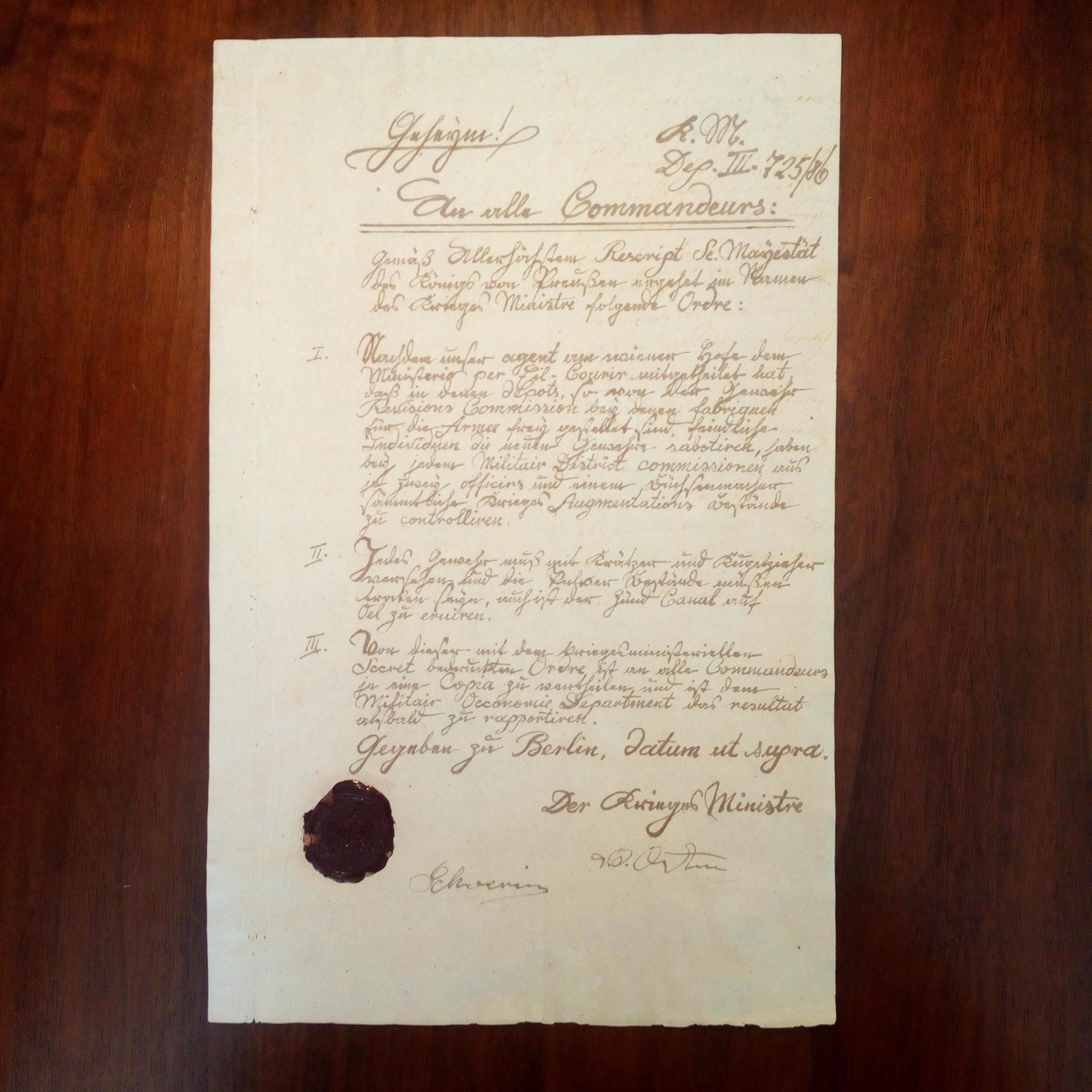 1726-94, balt. Adliger, preuß. Staatsmann, Geheimer Kriegsminister - Schreiben mit U., Gegenzeichnung des Generalleutnants und späteren Diplomaten Wilhelm Friedrich Karl von Schwerin (1739-1802), hier Inspekteur der Infanterie, Berlin "datum ut supra" (im bayer. Erbfolgekrieg 1779), 1 S. folio, Siegel, Aufschrift "Geheim!". ...An alle Commandeurs:/gemäß Allerhöchstem Rescript Se. Majestät des Königs (Friedrich II.): "Nachdem unser agent...mitgetheilet hat, daß...feindliche Individuen die neuen Gewehre sabotiren", habe er eine Kontrollkommission eingesetzt. ...Jedes Gewehr muß mit Krätzer und Kugelzieher versehen und die Pulver Bestände müßen trocken seyn, auch ist der Zünd Canal auf Oel zu eruiren...dem Militair Oeconomie Department das resultat alsbald zu rapportiren...