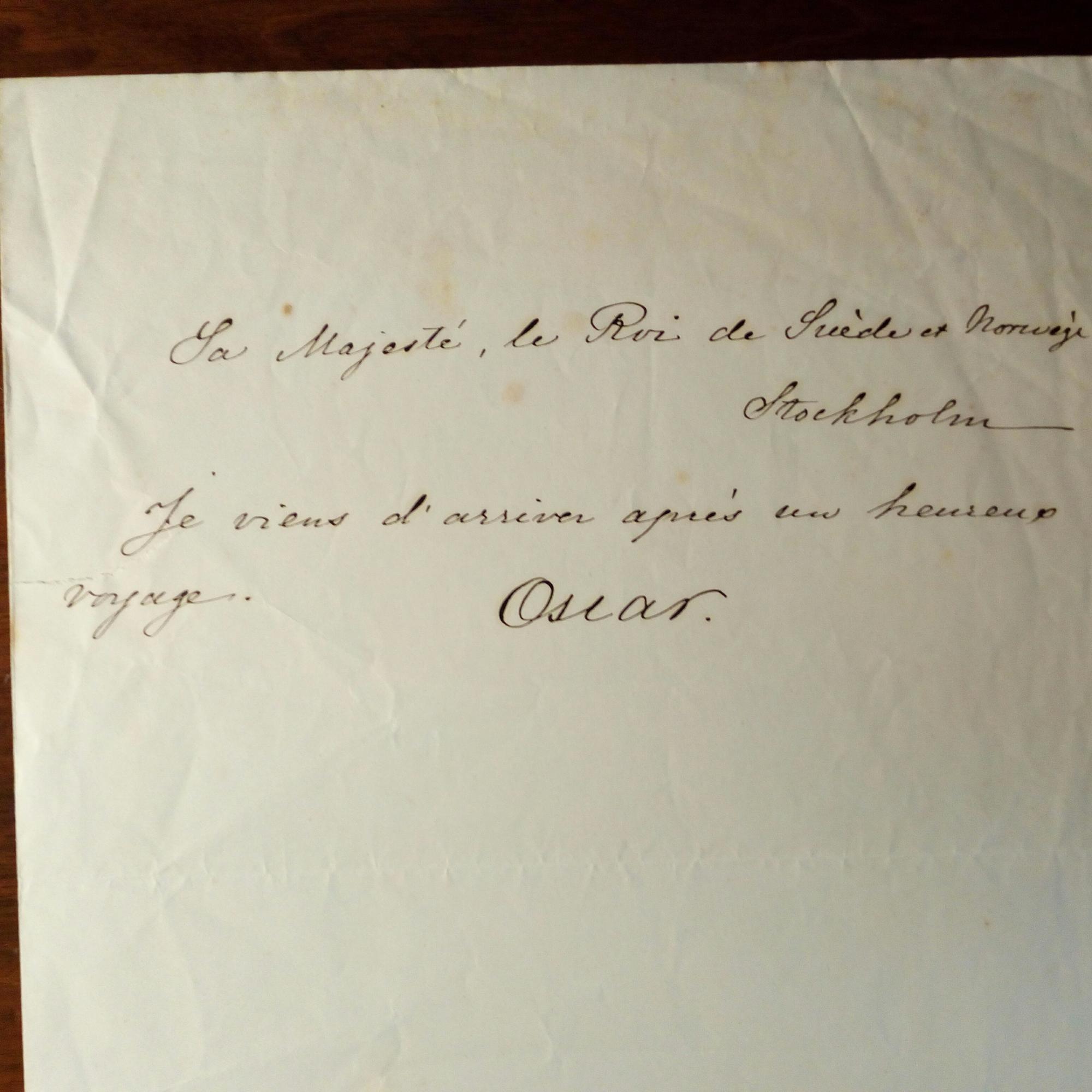 1829-1907, König - E. Telegramm-Entwurf m. U., ¾ S. gr.4°, kl. Gebr.spuren. ...Je viens d'arriver après un heureux voyage...
