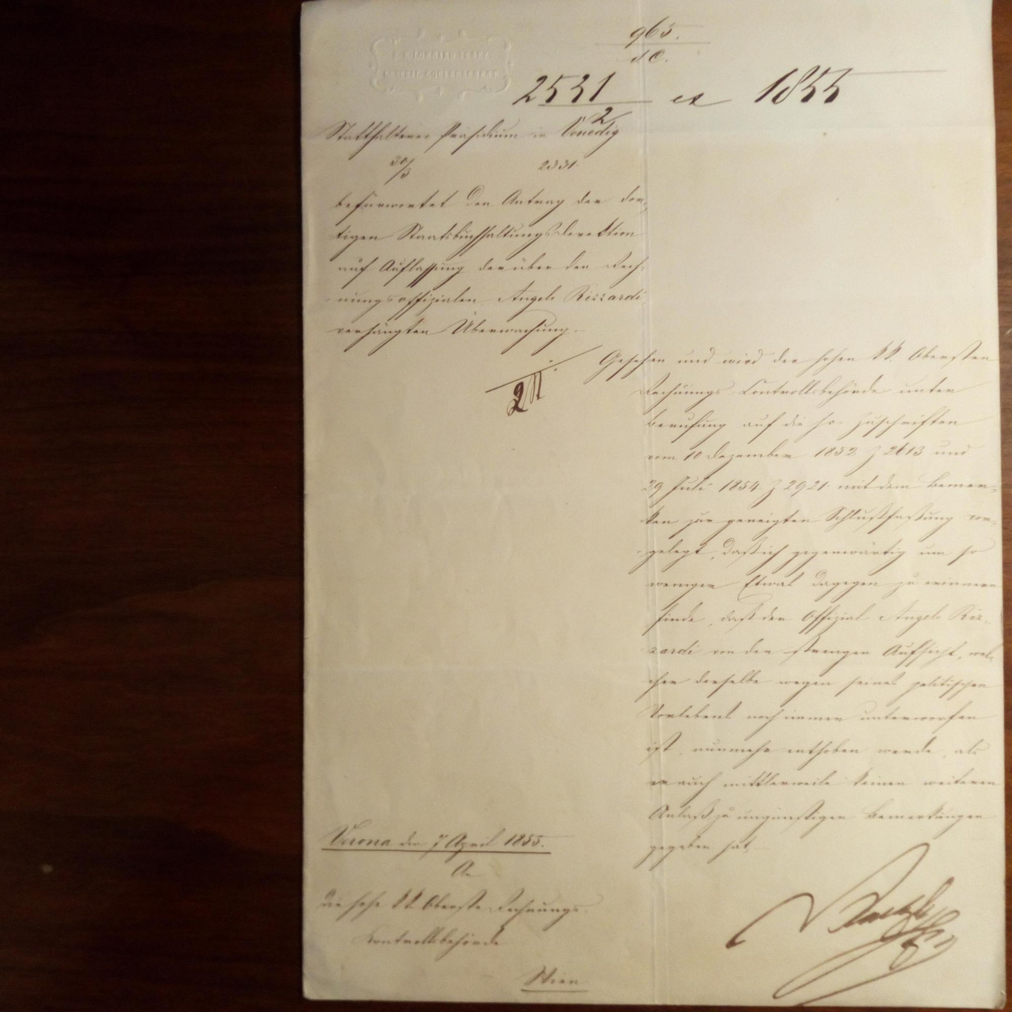 1766-1858, österr. Graf, Feldmarschall - Schreiben mit U., Verona 7.4.1855, 1 S. folio, gepr. Kopf als Gouverneur der Lombardei. An die Rechnungs-Kontrollbehörde in Wien: Empfiehlt, einen Offizier von dessen "strenger Aufsicht" (diese war aus politischen Gründen verhängt worden), zu entbinden.