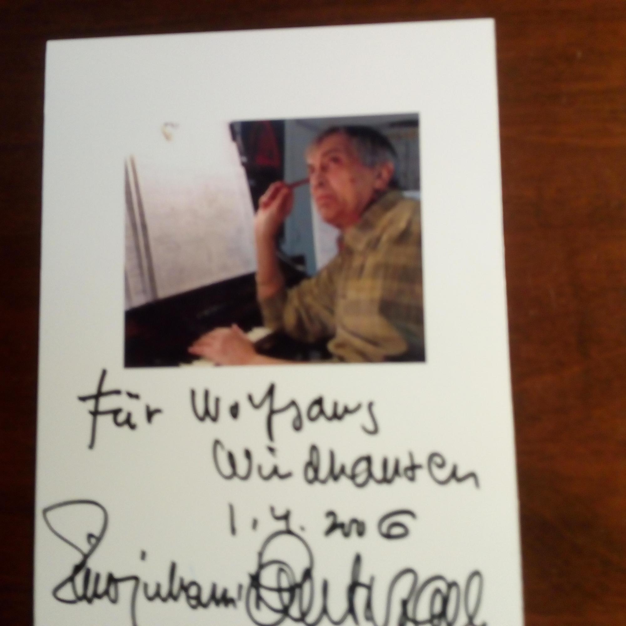 1928-2016, finn. Komponist - Karte m. kl. mont. Druck-Pfo. (beim Konponieren) m. Widm. und U., 1.4.2006.