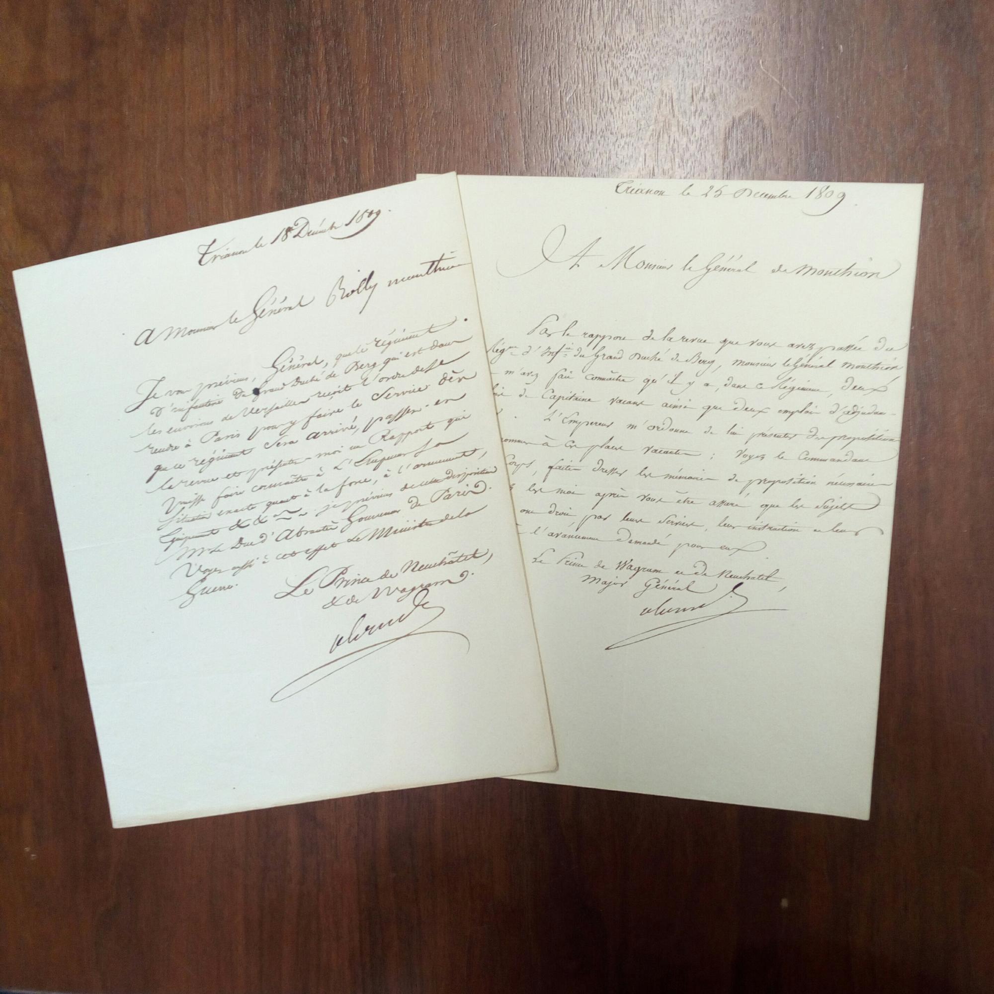 Prinz von Neuchâtel und Wagram, 1753-1815, General und Vertrauter von Napoleon, Maréchal de l'Empire - 2 Briefe mit U., Trianon Dez. 1809, je ¾ S. kl. 4°. An General François-Gédéon Bally de Monthion (1776-1850): 18.12.: ...le régiment d'infanterie du Grand Duché de Berg qui est dans les environs de Versailles reçoit l'ordre de se rendre à Paris pour y faire le Service. Dès que ce régiment sera arrivé, passez-en la revue et présentez-moi un rapport qui puisse faire connaître à l'Empereur sa situation exacte quant la force, à l'armement, équipement &&& - je préviens de cette disposition M. le Duc d'Abrantès Gouverneur de Paris (Andoche Junot)... 25.12.: ...vous avez fait connaître qu'il y a dans ce Régiment 2 emplois de capitaine vaccans ainsi que 2 emplois d'adjudance- Major. L'Empereur m'Ordonné de lui présenter des propositions...