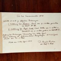 1830-88, protestant. Theologe - Schönes 8°quer-Blatt m. U., Halle 23.4.1870. Vorlesungsankündigung: "Erklärung der Psalmen" und "Erklärung des Propheten Amos" für das Sommersemester 1870 und Mitt. der Sprechstunden in seiner Wohnung. Mont.spur am li. Rand.
