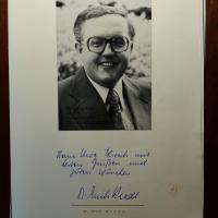 1933-2018, CSU-Politiker - Pfo. (Hochglanz) mit U. und D. 10.9.1974. 4 Beilagen aus späteren Zeiten: ausführl. Widm. und U. unter auf 4° mont. Pfo., Pfo. mit Widm. und U. und 2 SK mit U. und D.