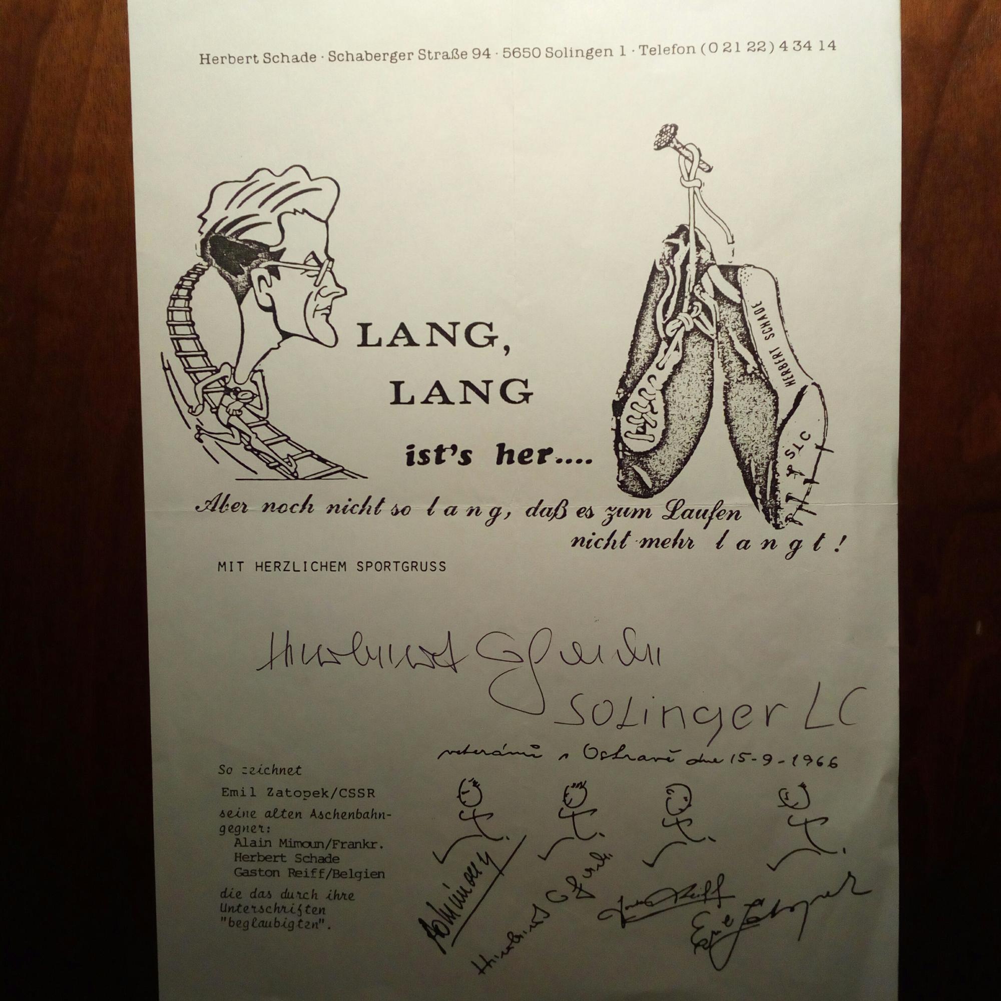 1922-94, Laufsportler - Scherzblatt (4°) mit e. Kopieen. E. "Solinger LC.", U. und 15.9.1966. Mit Briefkopf und witzigen Faksimiles von den Läufer-Kollegen Mimoun, Reiff und Zatopek.