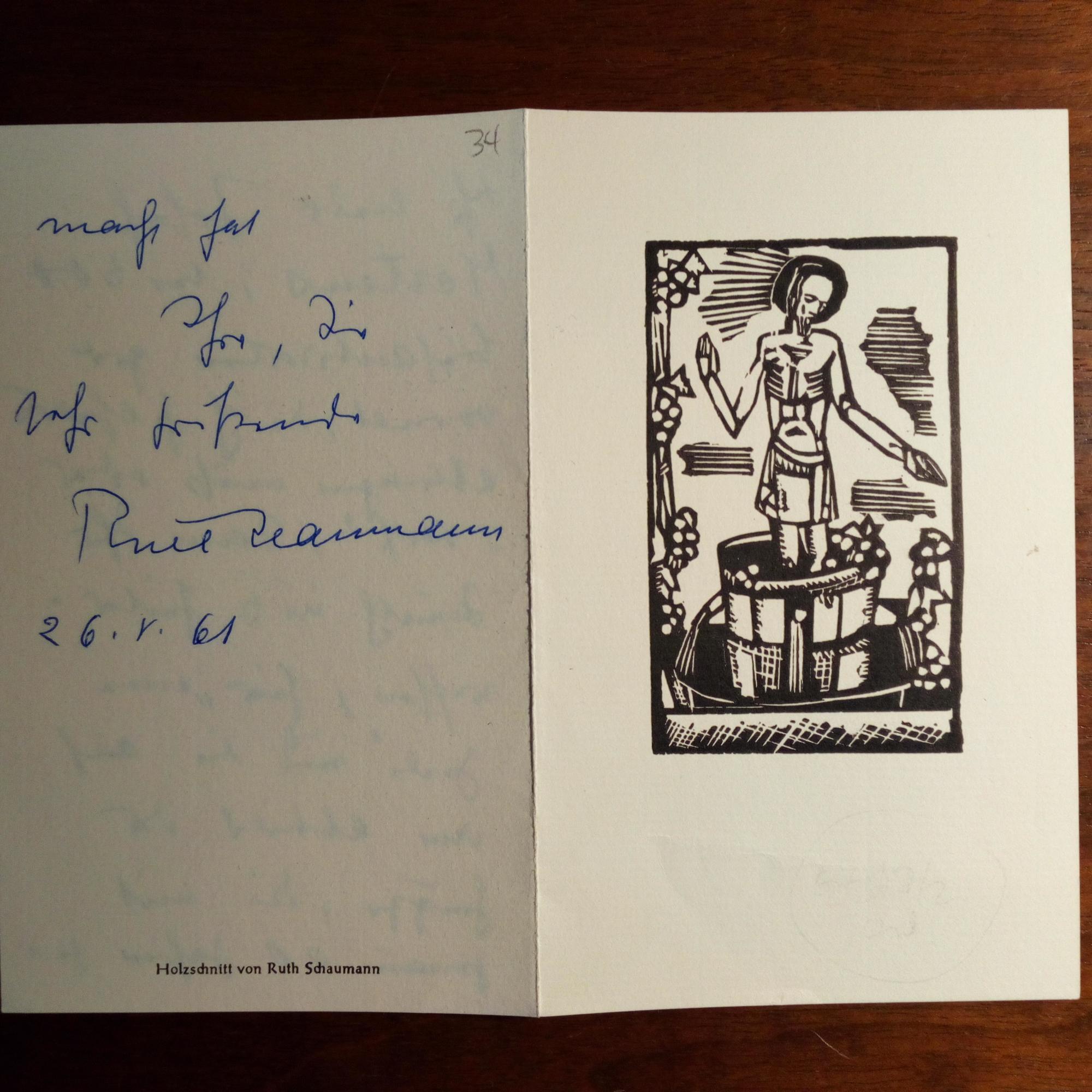 1899-1975, Schriftstellerin - Br. m. U., 28.8.1957, auf Rückseiten von 2 Werk-Ansichtskarten (nach Holzschnitten von ihr), dicht geschr. An den Kunst-Antiquar Günter Fuchs (1935-2007) in Berlin: Versucht ihr Buch "Der singende Fisch" zu bekommen: ...im 3.Reich wurde auch dies ... vernichtet ... die Berufung zum Dichter und Künstler zugleich ist der elendeste Beruf in irdischer Zeit, in der Atombomben und Maschinen die Macht haben...