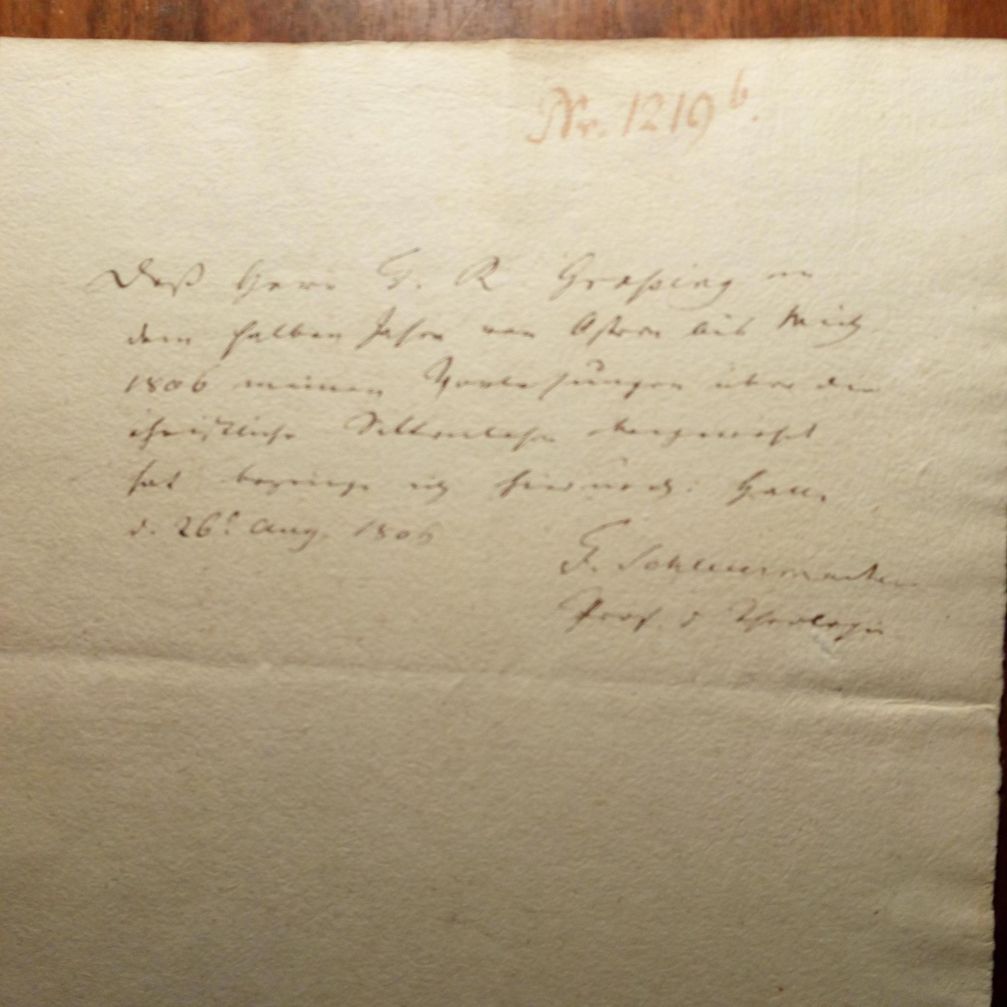 1768-1834, protestant. Theologe und Philosoph - E. Schreiben mit U., (Halle) 26.8.1806, ca. ½ S. kl. 4°. Vorlesungsbescheinigung (...über die christliche Sittenlehre...) für G. R. Greßing. Nummerierung der Sammlung Reiss.