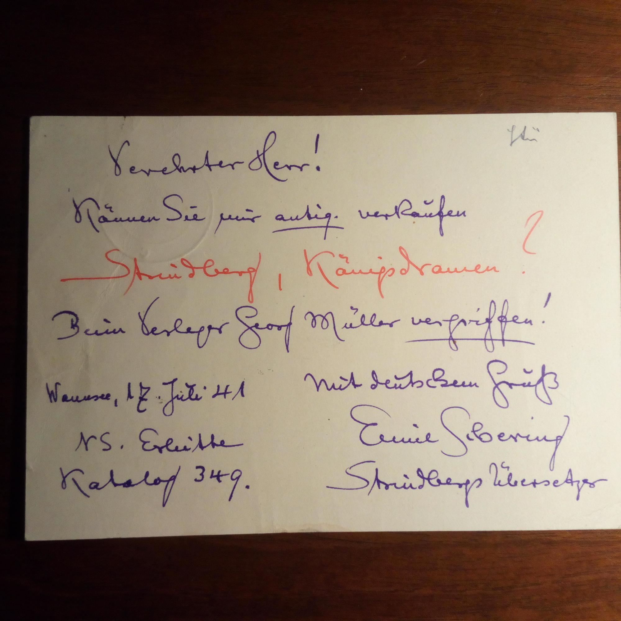 1873-1951, Schriftsteller und Redakteur, Übersetzer von A. Strindberg - E. postal. Postkarte m. U. und "Strindbergs Übersetzer", Wannsee 17.7.1941, über dem e. Absendser kl. Ansicht von Oberschleuna. Bestellt beim Antiquariat Zahn & Jaensch in Dresden Strindbergs Königs-dramen, da sie beim Verleger G. Müller vergriffen seien.