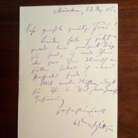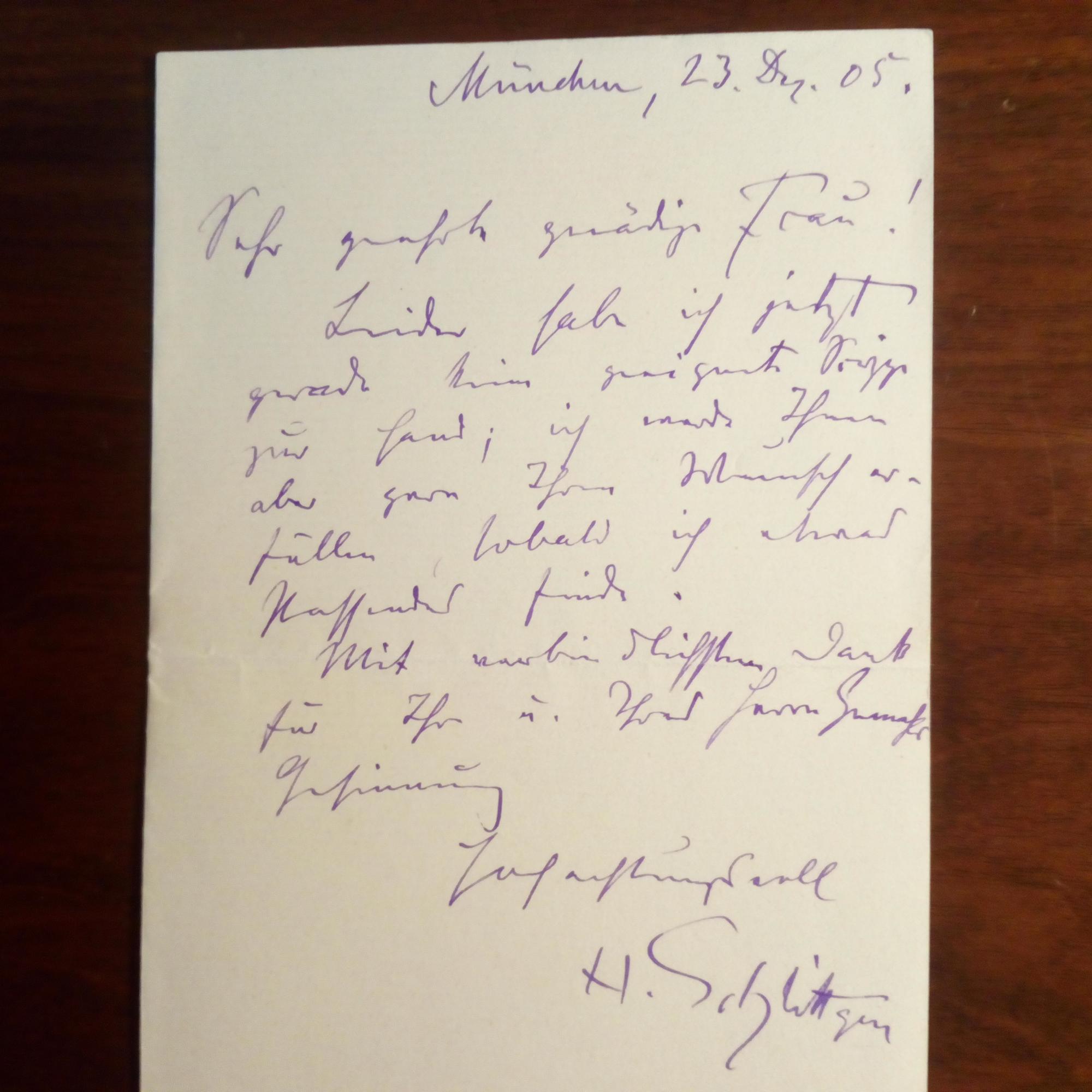 1859-1930, Maler - E. Br. m. U., München 23.12.1905, ¾ S. kl.8°. An eine Dame: ...Leider habe ich jetzt gerade keine geeignete Skizze zur Hand; ich werde Ihnen aber gern Ihren Wunsch erfüllen...