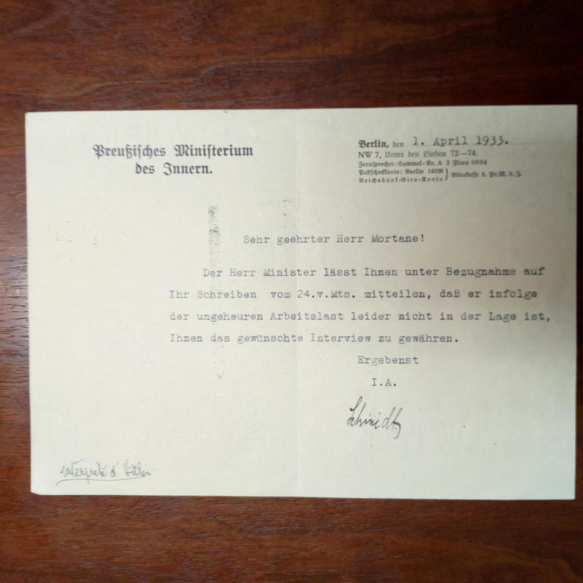 1886-1955, Jurist und Politiker - Brief mit U., 1 S. 8° quer, (Berlin) 1.4.1933, Briefkopf als "Kommissar für Sonder-aufträge" im Innenministerium. An den frz. Fliegerei-Journalisten Jacques Mortane (1883-1939): Teilt ihm im Namen von Innenminister Hermann Göring mit, "daß er infolge der ungeheueren Arbeitslast leider nicht in der Lage ist, Ihnen das gewünschte Interview zu gewähren...".