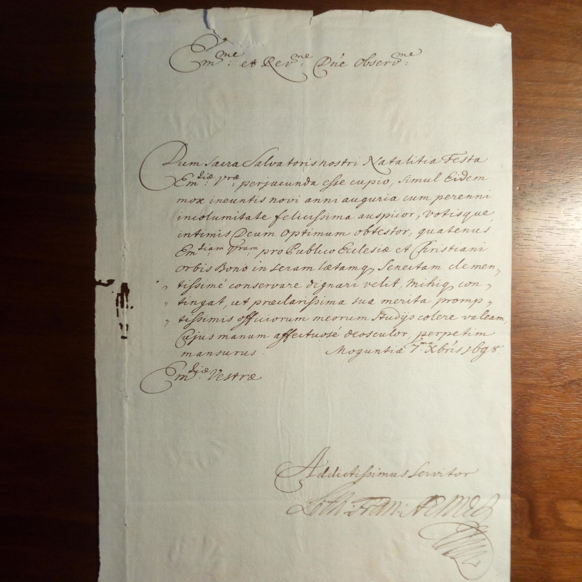 1655-1729, Fürstbischof von Bamberg und Erzbischof von Mainz - 3 Briefe mit U., Mainz 1698, und Bamberg 1699 und 1701, je 1 S. folio, Gebr.spuren. Lateinisch. Teilt amtliche Maßnahmen mit (u.a.. Beförderung eines Lehrers).