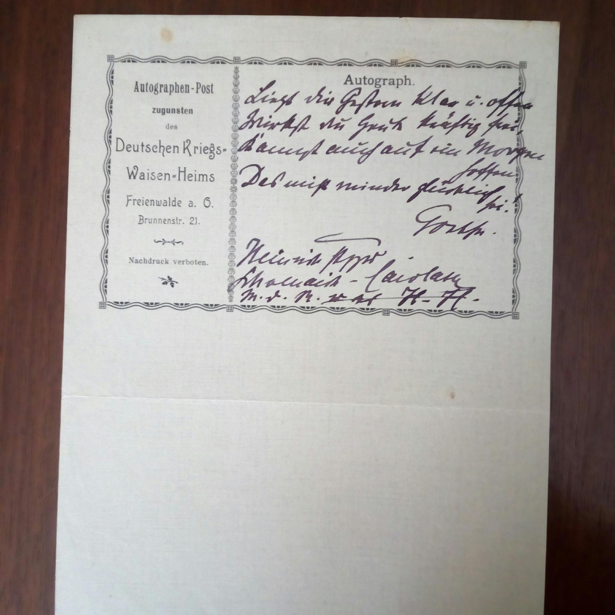 1852-1908, Prinz, Gutsherr u. Schriftsteller - E. postal. Postkarte mit U., St. Blasien (Schwarzw.) 27.3.(1906), kl. Schrift, ger. Altersspuren. An Hoffotograf Paul Stecher (1871-1958) in Bad Pyrmont: Er möge "einen recht guten scharfen Abzug der Cabinet -en face- Aufnahme herstellen" und an den Theologen und Pädagogen Carl Hunnius in Dorpat (Estland) senden. Bittet um Bestätigung und Rechnung. Beiliegt e. kl. Briefkarte mit U., Siegelrest. Bestellt i. N. seiner Gattin Katharina (von Knorring. 1867-1946) "etliche Bücherhandschriften...".