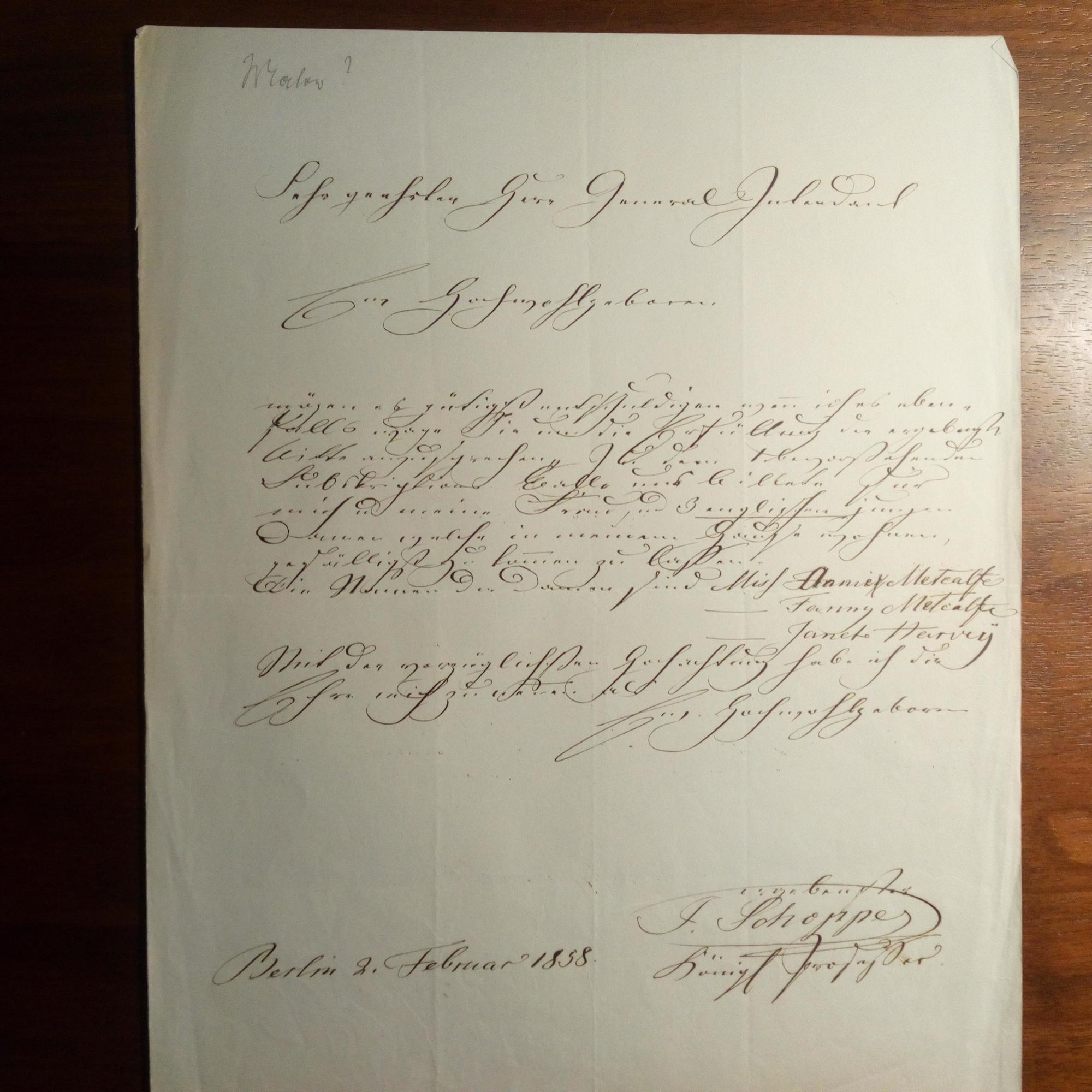 1795-1868, Maler - Dekorativer e. Br. m. U., Berlin 2.2.1858, 1 S. folio. An einen "General-Intendanten": Bittet für sich, einen Freund und 3 "englische junge Damen" um "Subskriptions-Billette".