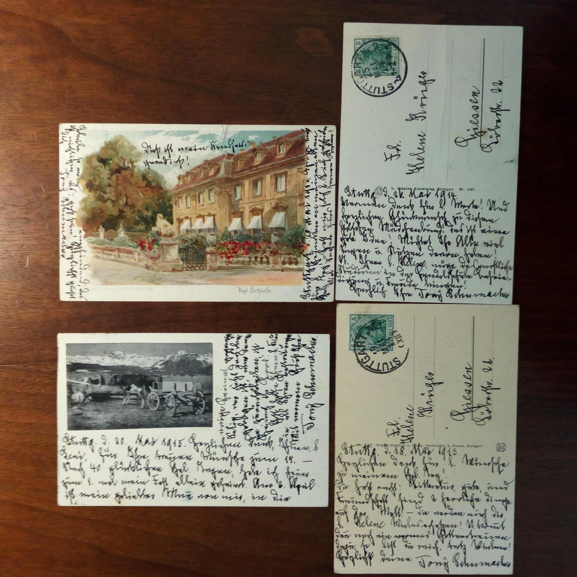 1848-1931, Kinder-Schriftstellerin - 4 e. postal. Ansichtskarten (2 vom Schloss in Stuttgart) mit U. Stuttgart 1912-15 und privates Foto (mit dem Gatten in ihrem "Königin-Luise-Zimmer") mit e. "Mein Glück und mein Heim" und U. Alle an Frl. Helene Krüger in Gießen: Dankt herzlich und persönl. für Geb.wünsche.