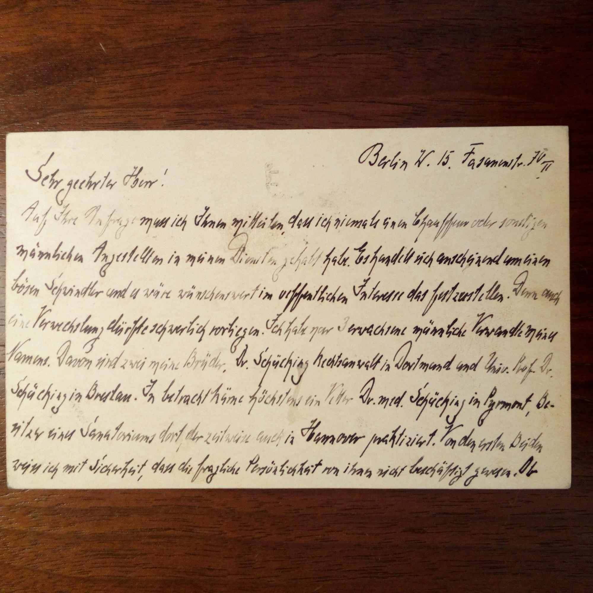 1875-1935, Jurist und Politiker, erster dt. Richter am Int. Gerichtshof in Den Haag - E. postal. Postkarte mit U., Berlin (15.1.1925), ger. fleckig. An den Hamb. Flieger-General-Ingenieur Hans Fischer (1895-1943): ...muss ich Ihnen mitteilen, dass ich niemals einen Chauffeur oder sonstigen männlichen Angestellten in meinen Diensten gehabt habe...