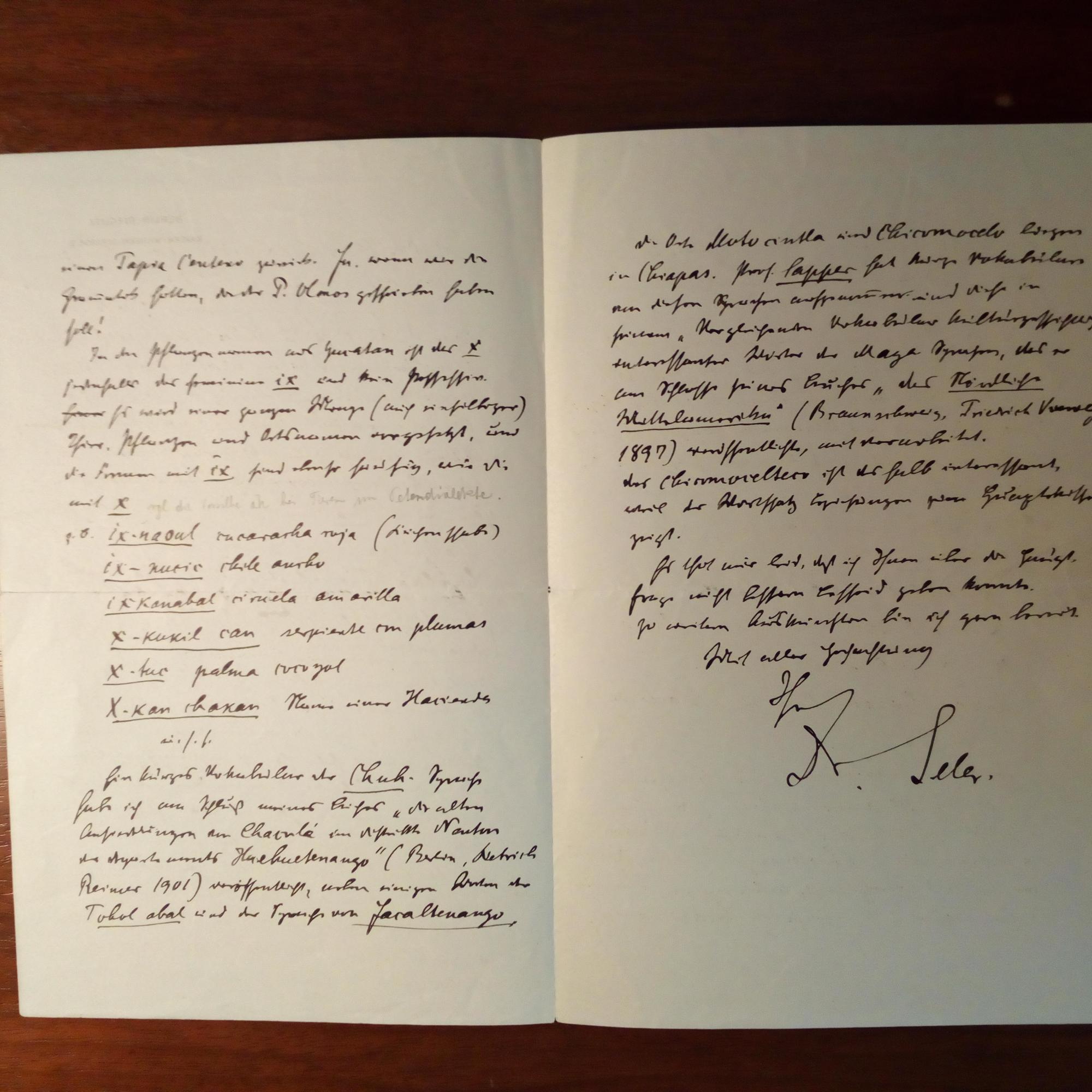 1849-1922, Alt-Amerikanist - E. Brief mit U., Berlin 24.11.1913, 3 ¾ S. gr.8°, dicht beschr., erste S. etwas fleckig. An einen Kollegen: Details zur Grammatik der Maya-Sprache.