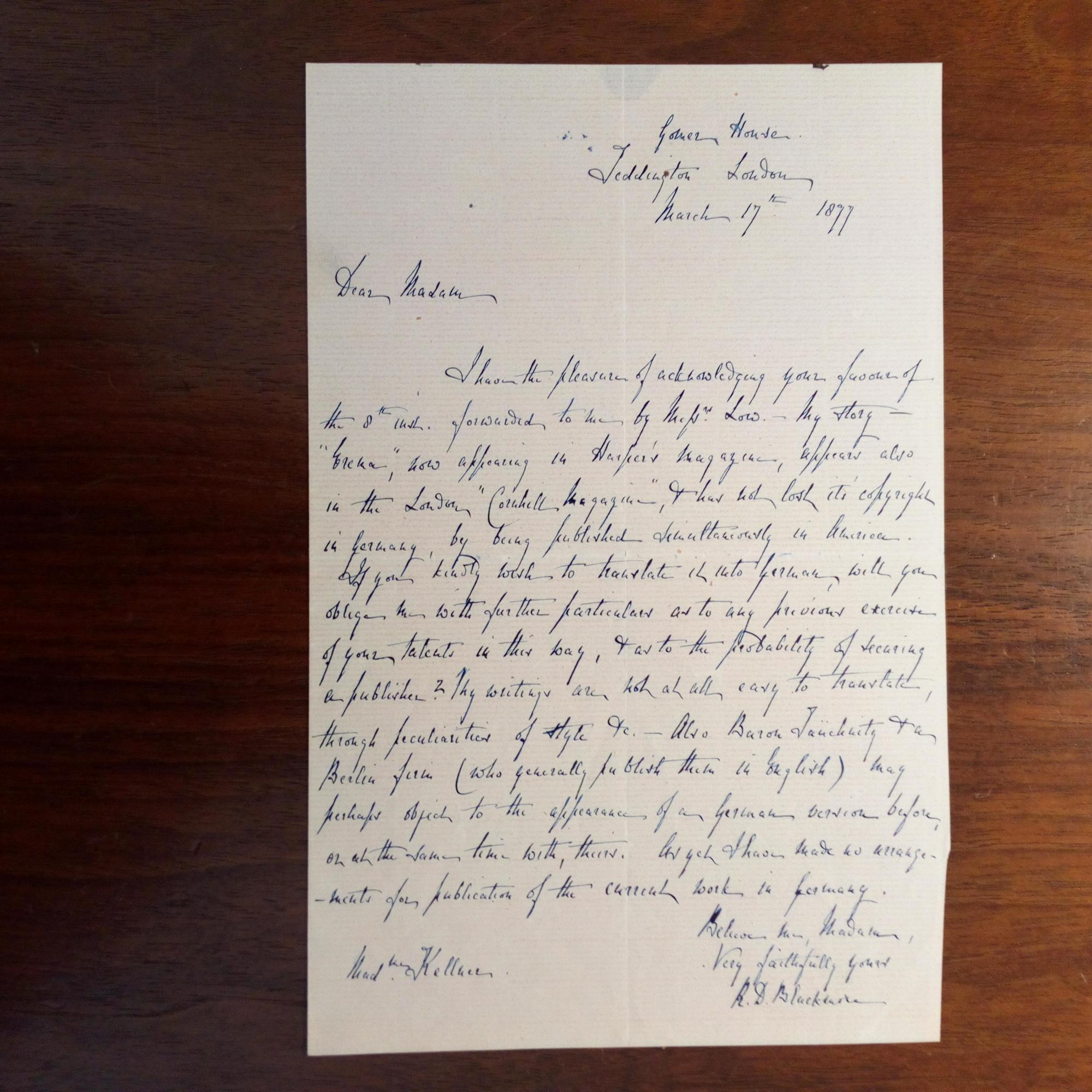 1825-1900, brit. Schriftsteller - E. Br. m. U., London 17.3.1877, 1 S. 8°, kl. Schrift. An Frau Kellner betr. Publikationen u. Übersetzung seiner Novelle "Erema" auch in Deutschland.
