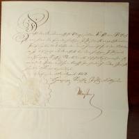 1828-1903, preuß. Staatsbeamter - Urkunde für ihn mit U. ("Meister" für das Gothaer Justiz-Kollegium), Gotha 28.4.1852, ½ S. folio. ...wird bescheinigt, dass er die für den hiesigen Justizdienst vorgeschriebene Prüfung bestanden hat..., kl. Kalligraphie, gut erh. Siegel.
