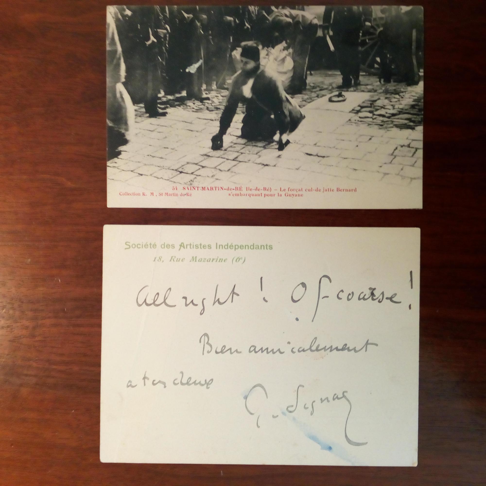 1863-1935, frz. Maler - E. Brief mit U., La Rochelle o. D., auf Rückseite einer Ansichtskarte ("Saint-Martin-de-Ré - Le forcat cul-de jatte Bernard s'embarquant pour la Guyane", Sträflinge, wohl nach 1885). An einen befreundeten Künstler: ...On aquarelle à la Rochelle! J'y reçois une coupure si gentille de votre semaine artistique que je m'empresse de vous adresser, avec mon amical souvenir, tous mes remerciments et comme prime, cette image: la Justice poursuivant le Crime, navale Version!... Beiliegt Karte mit e. Grüßen und U., Br.kopf der "Société des Artistes Indépendants" in Paris (m. Gebr.spuren).