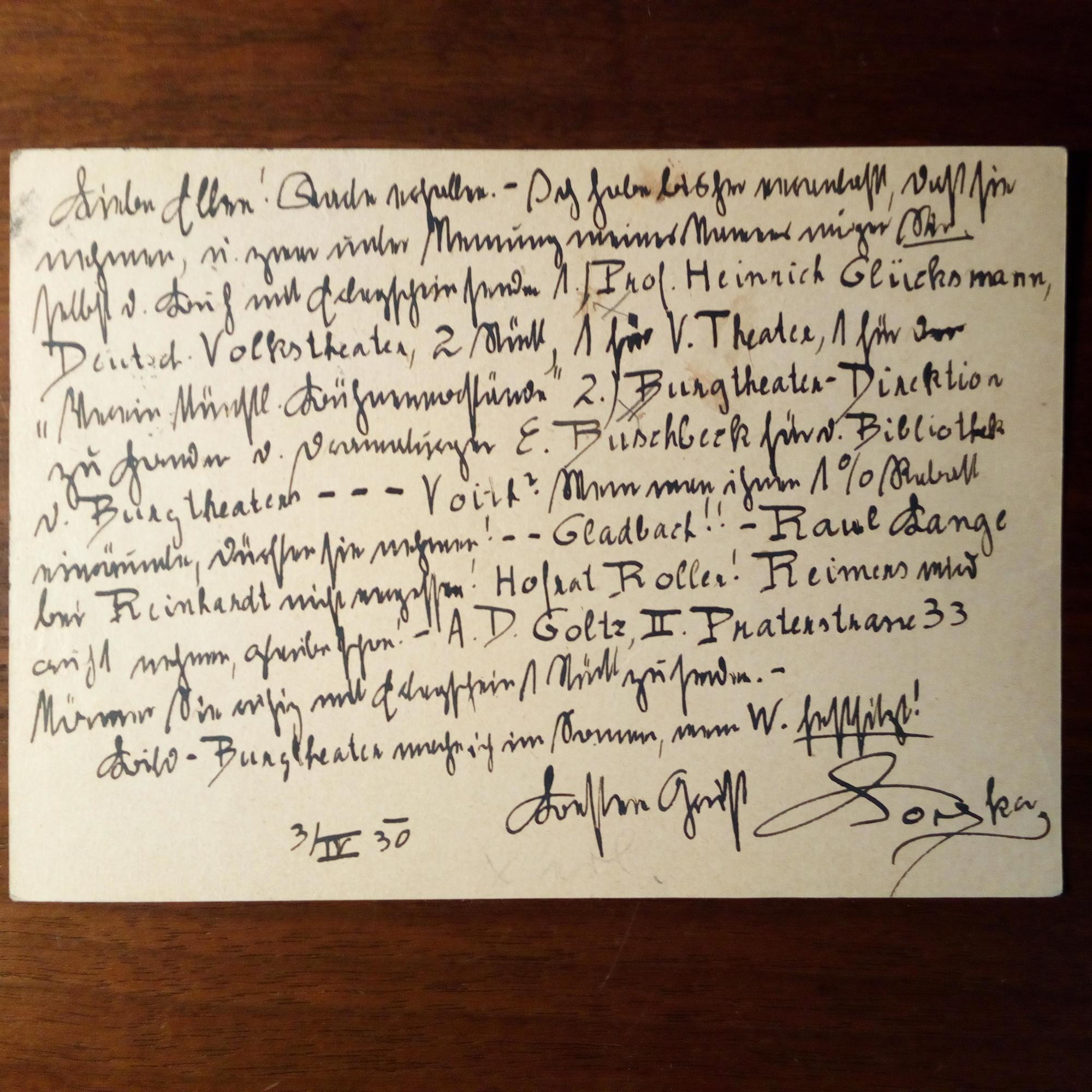 1882-1955, Schriftsteller und Journalist - E. postal. Postkarte mit U., (Baden b. Wien) 3.4.1930. An die Aktivistin der dt. Jugendbewegung, Schriftstellerin, bild. Künstlerin und Psychotherapeutin Ellen Gregori (1897-1981). Sie möge eine Schrift selbst versenden und gibt die entspr. Adressen an, dabei: Prof. Heinrich Glücksmann, E. Buschbeck vom Burgtheater, "Paul Lange bei Reinhardt", Reimers, Goltz...