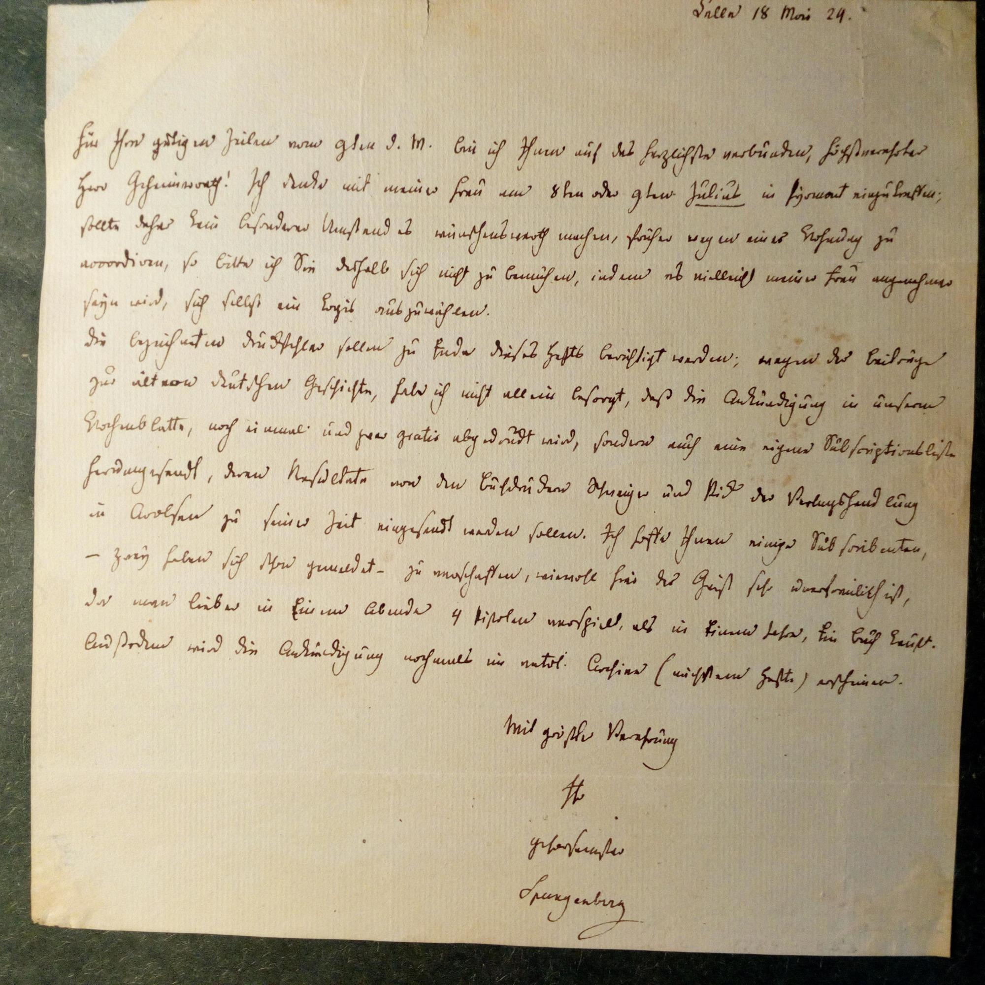 1784-1833, Jurist - Schöner e. Brief mit U., Celle 18.5.1824, 1 S. kl. 4°, mont. auf 4°. An einen "Geheimrat" betr. Publikationen zur Dt. Geschichte und geplanten Besuchs.